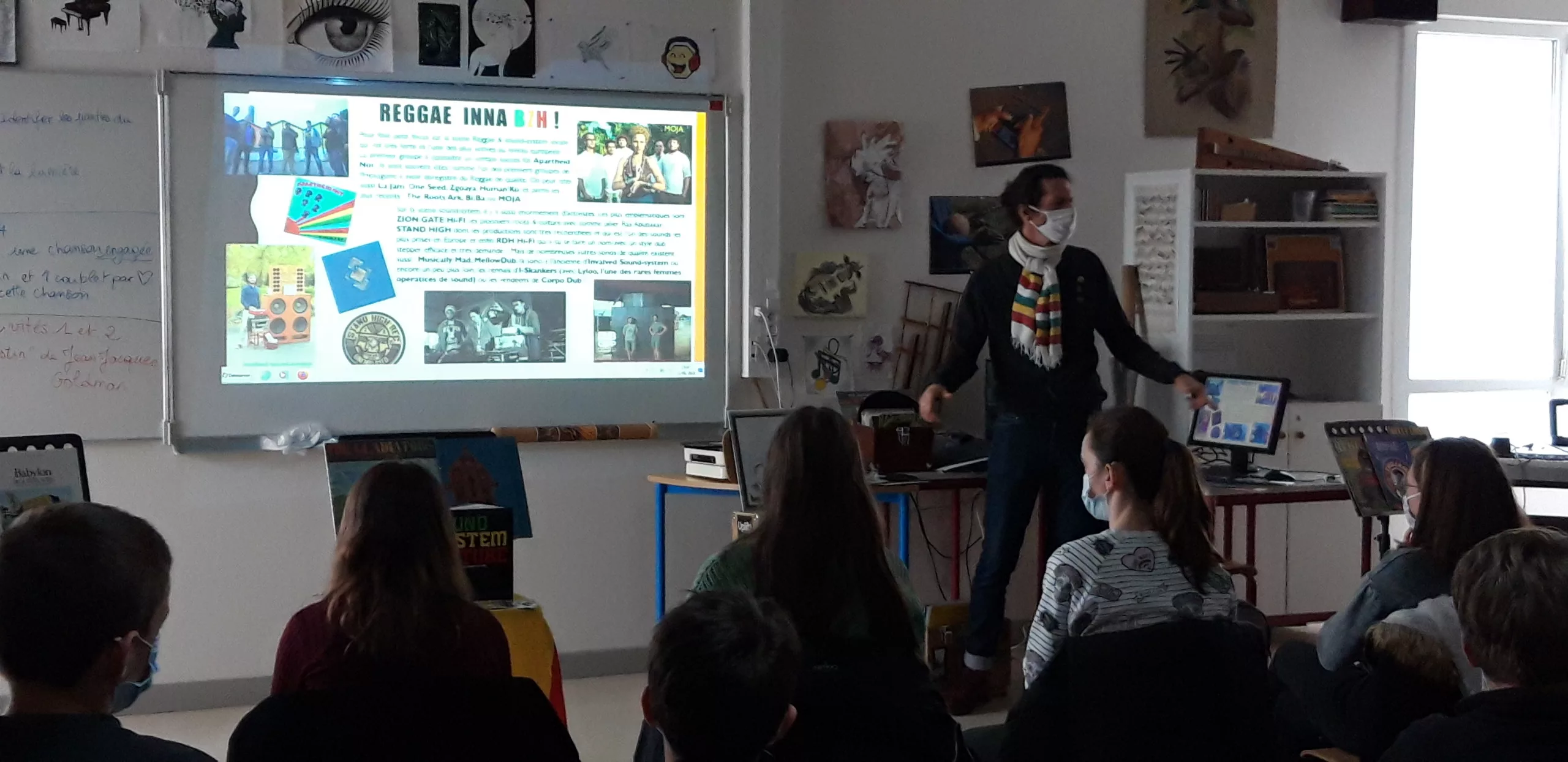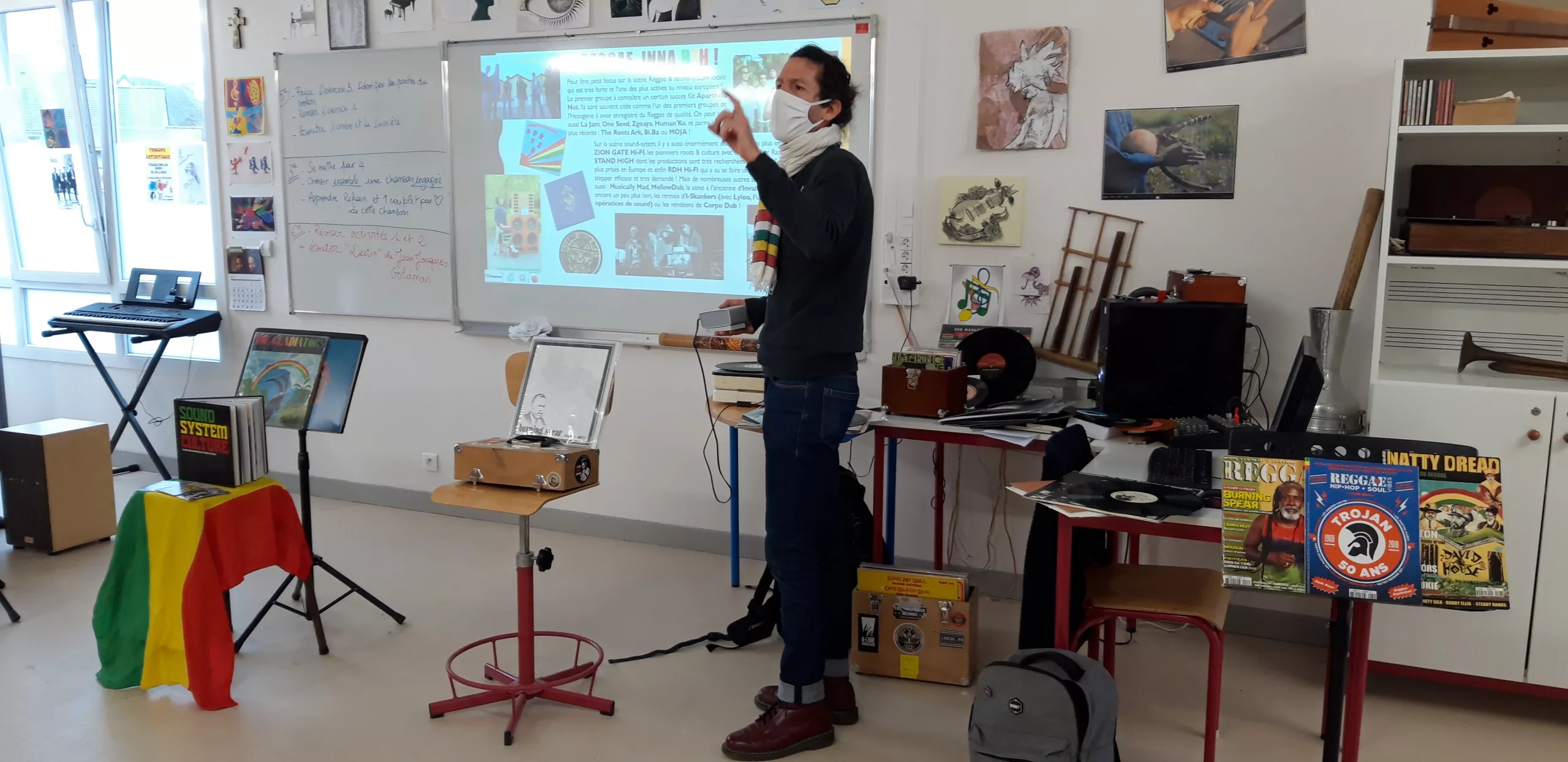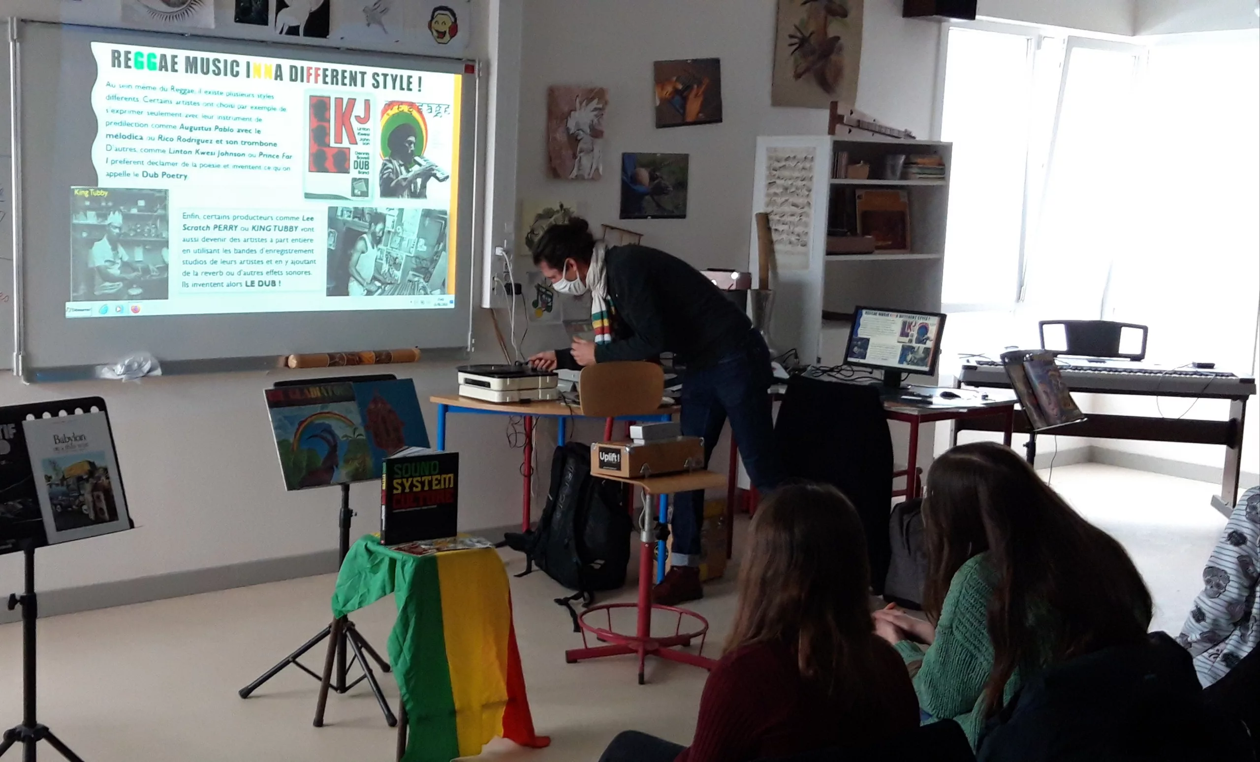Du mento au ska, en passant par le rocksteady, le reggae et le dub, c’est l’histoire riche et variée de la culture sound system que Philippe Muller « Papayatik » a raconté en vinyles et en images. Cette conférence, en amont des ateliers, a permit aux élèves de découvrir les bases de cette culture. Papayatik, passionné et passionnant a transporté les collégiens dans le temps et de l’autre côté de l’Atlantique !
