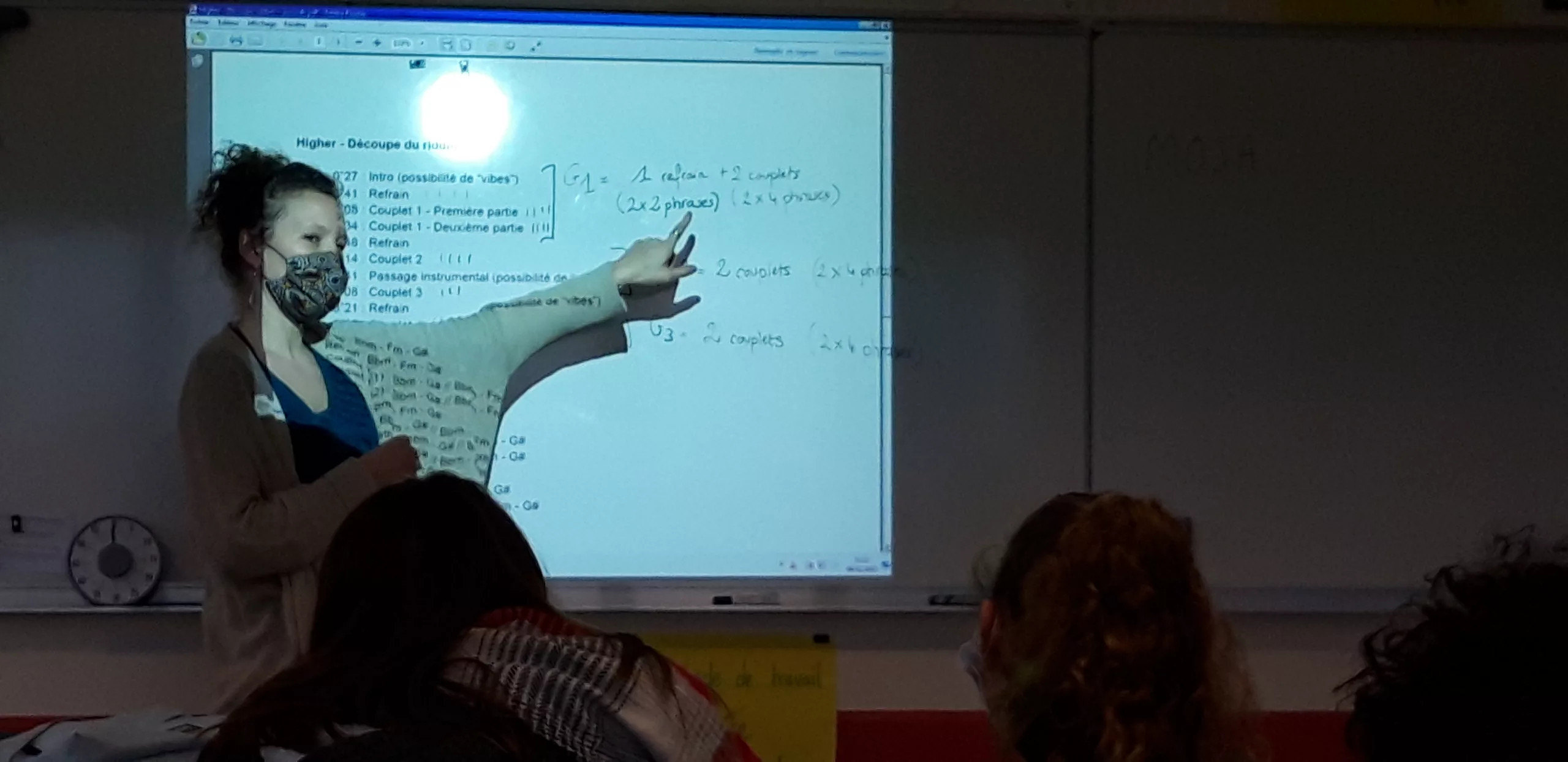 En demi-groupe avec Marine, les élèves ont commencé à écrire les couplets de leur chanson sur un riddim extrait du répertoire de Moja avec une première approche mélodique du reggae. En parallèle, l’autre demi-groupe, sous la conduite de Simon, a repris un morceau de Moja en percussion. Pour comprendre la rythmique spécifique au reggae, les collégiens l’ont testé lors de rapides exercices mais aussi découvert ces influences que l’on retrouve dans d’autres styles musicaux.