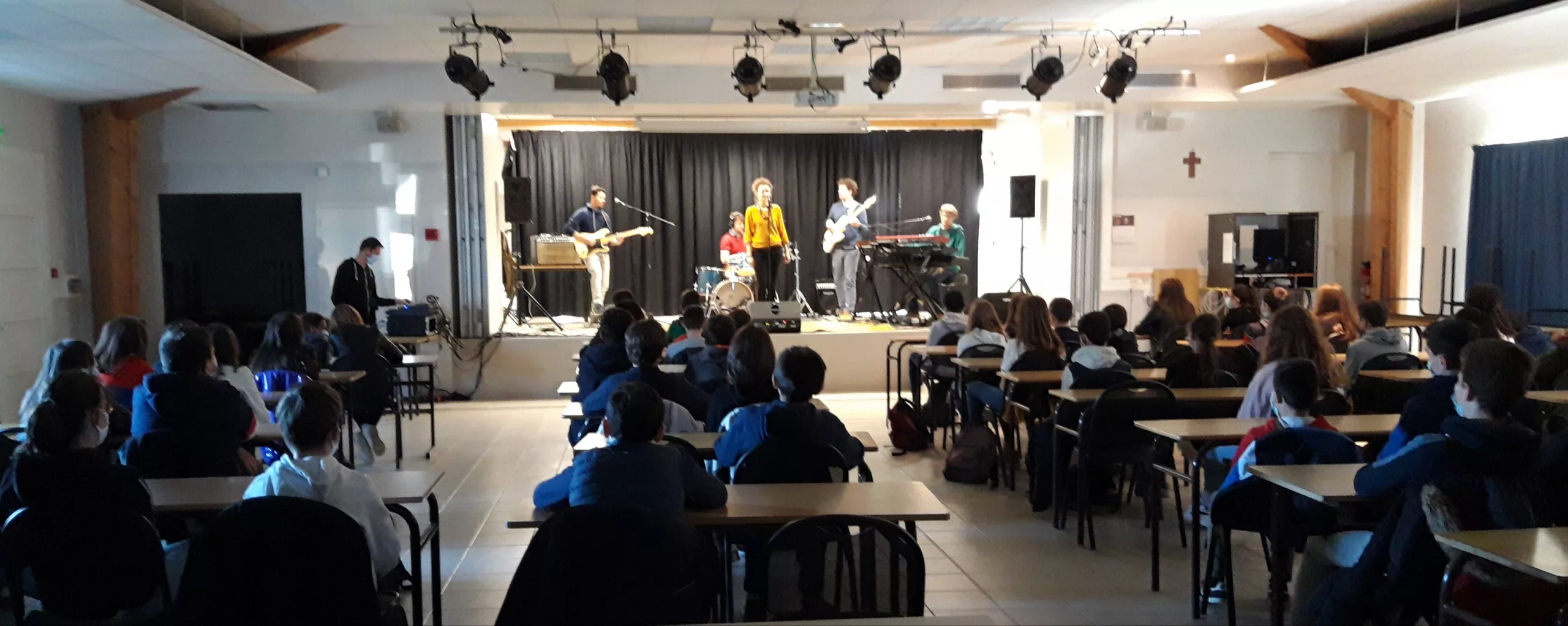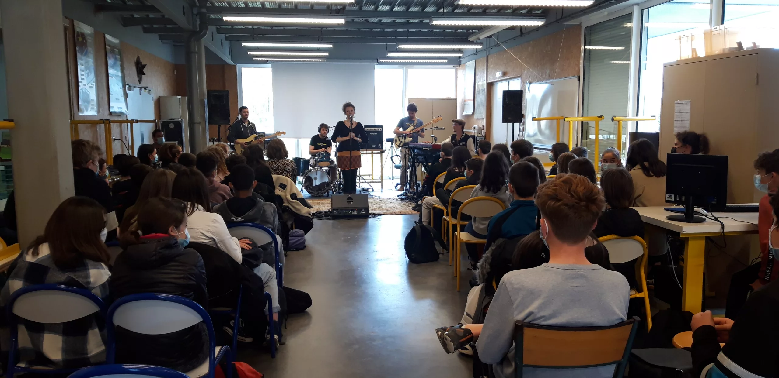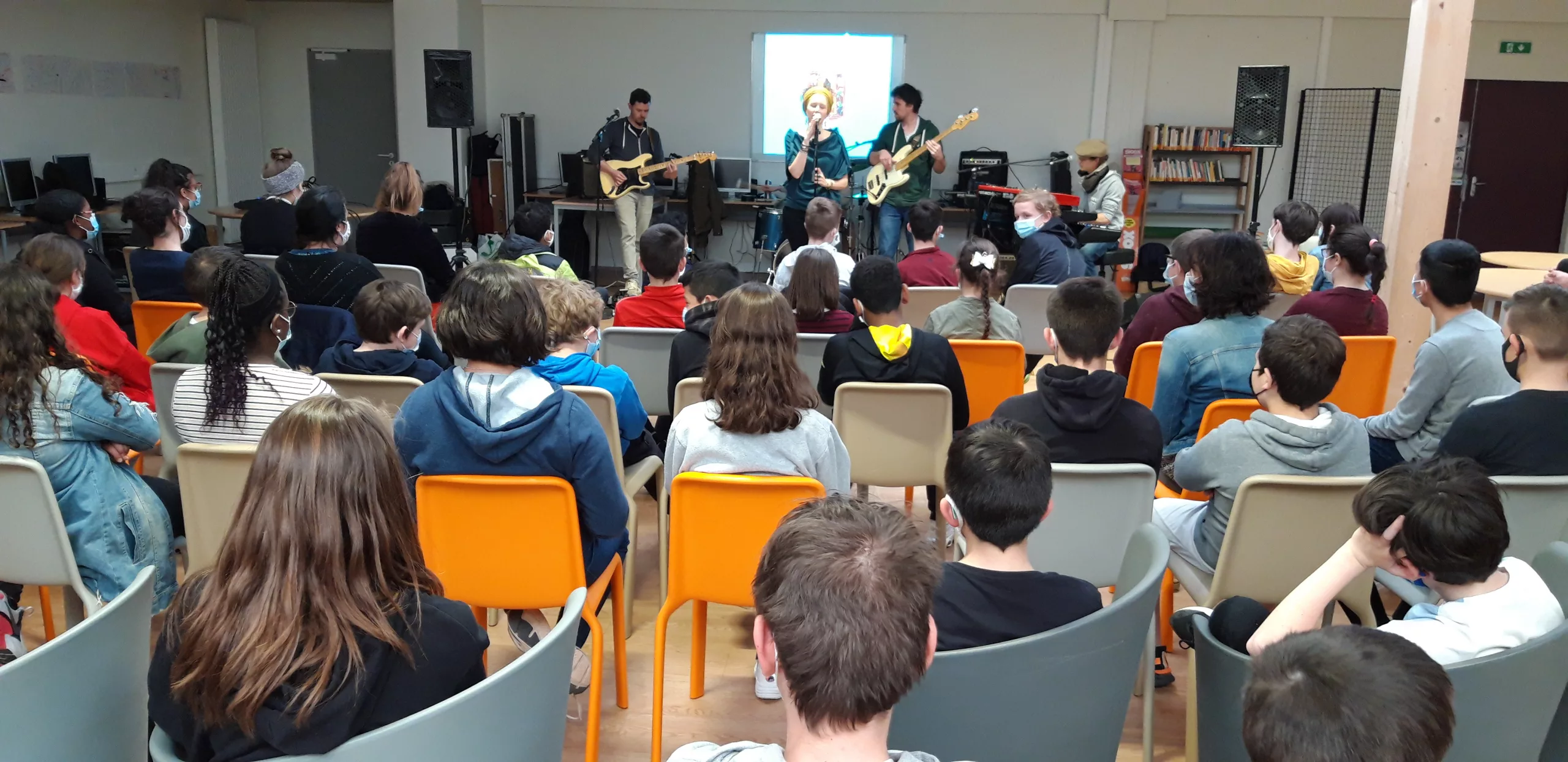 Durant 2h, les élèves de 6 classes ont découvert les bases du reggae à travers le langage rythmique, les percussions avec Simon et le chant en compagnie de Marine. En amont en classe, ils ont entamé un travail à partir des textes de Moja sur les thématiques traditionnellement abordées dans le reggae.