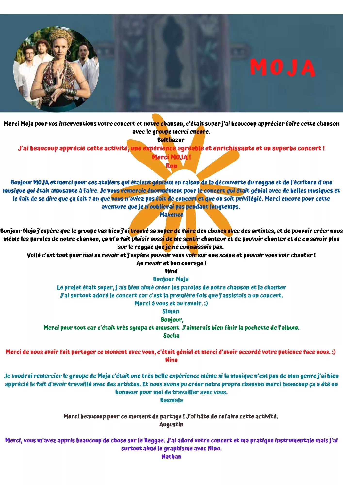 « Avec ce parcours consacré au mouvement sound system et au reggae, nous voulions déconstruire les clichés et de faire découvrir aux élèves les richesses de cette culture musicale. Trop souvent réduite à Bob Marley, la musique jamaïcaine a des ramifications aussi vastes que le jazz ou le blues. Né de la fusion d’anciens rythmes des Caraïbes avec des sons issus du rhythm’n’blues, du ska ou du rocksteady, ce style musical a inspiré les musiques urbaines contemporaines, invitant dans son vocabulaire le DJ, le MC, le remix…C’est cette inventivité, cette liberté d’approche que nous souhaitions partager avec les élèves à travers un parcours riche de rencontres et de créativité ! En compagnie du groupe Moja, douze classes de la 5ème à la 3ème se sont initiées à la culture sound system et au reggae. Get up ! »