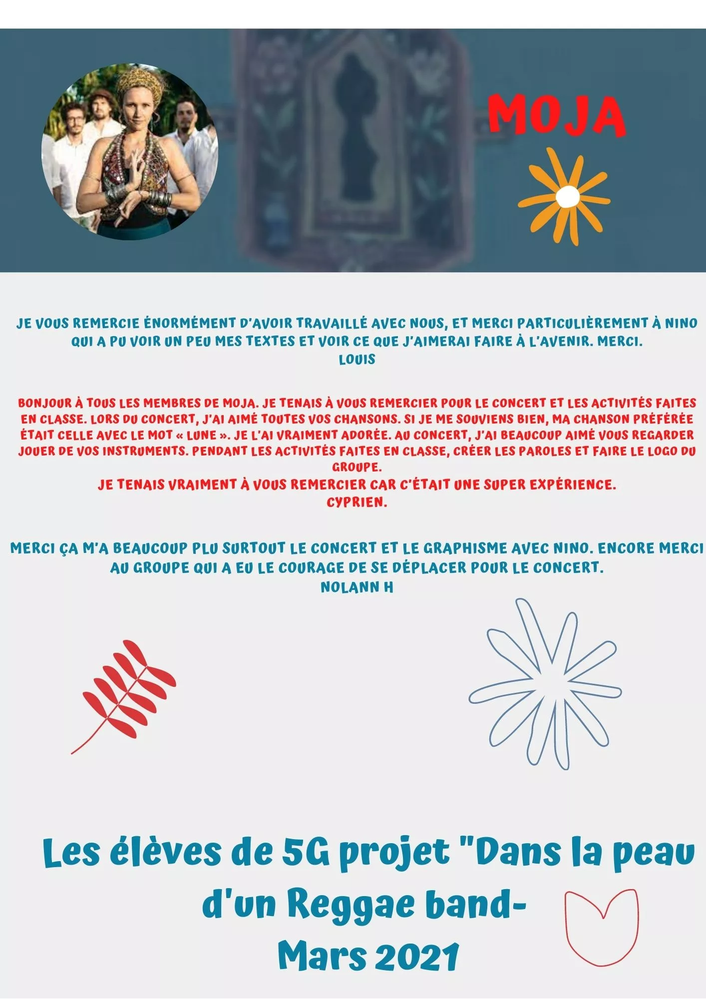 À partir d’un morceau de Moja commun à toutes les classes, les élèves ont réécris les paroles sur un thème choisi avec leurs enseignants et réadapté musicalement le riddim pour créer une chanson reggae à leur image. Ils imagineront également le visuel de leur single lors de la dernière séance. Un groupe est né !