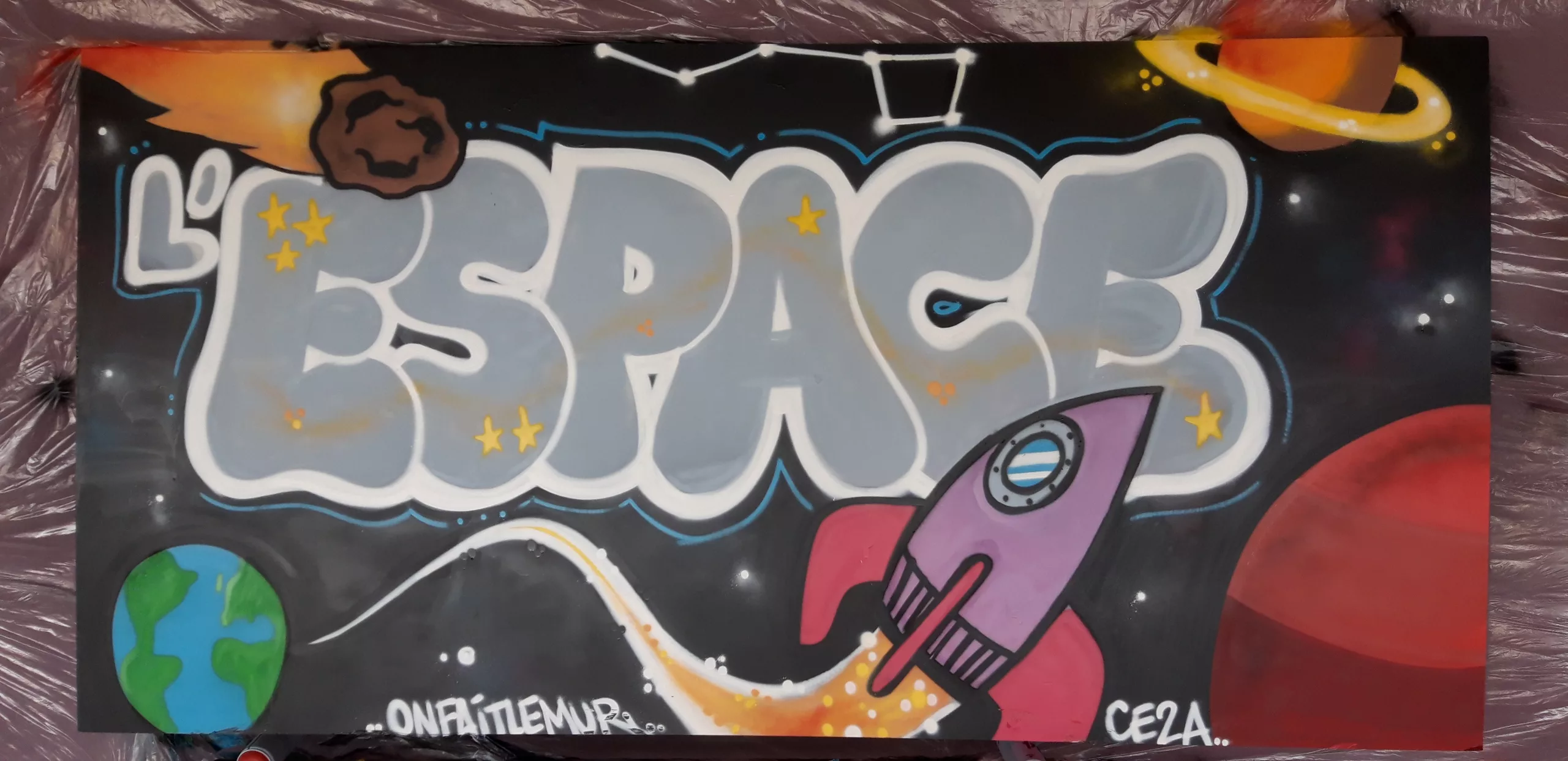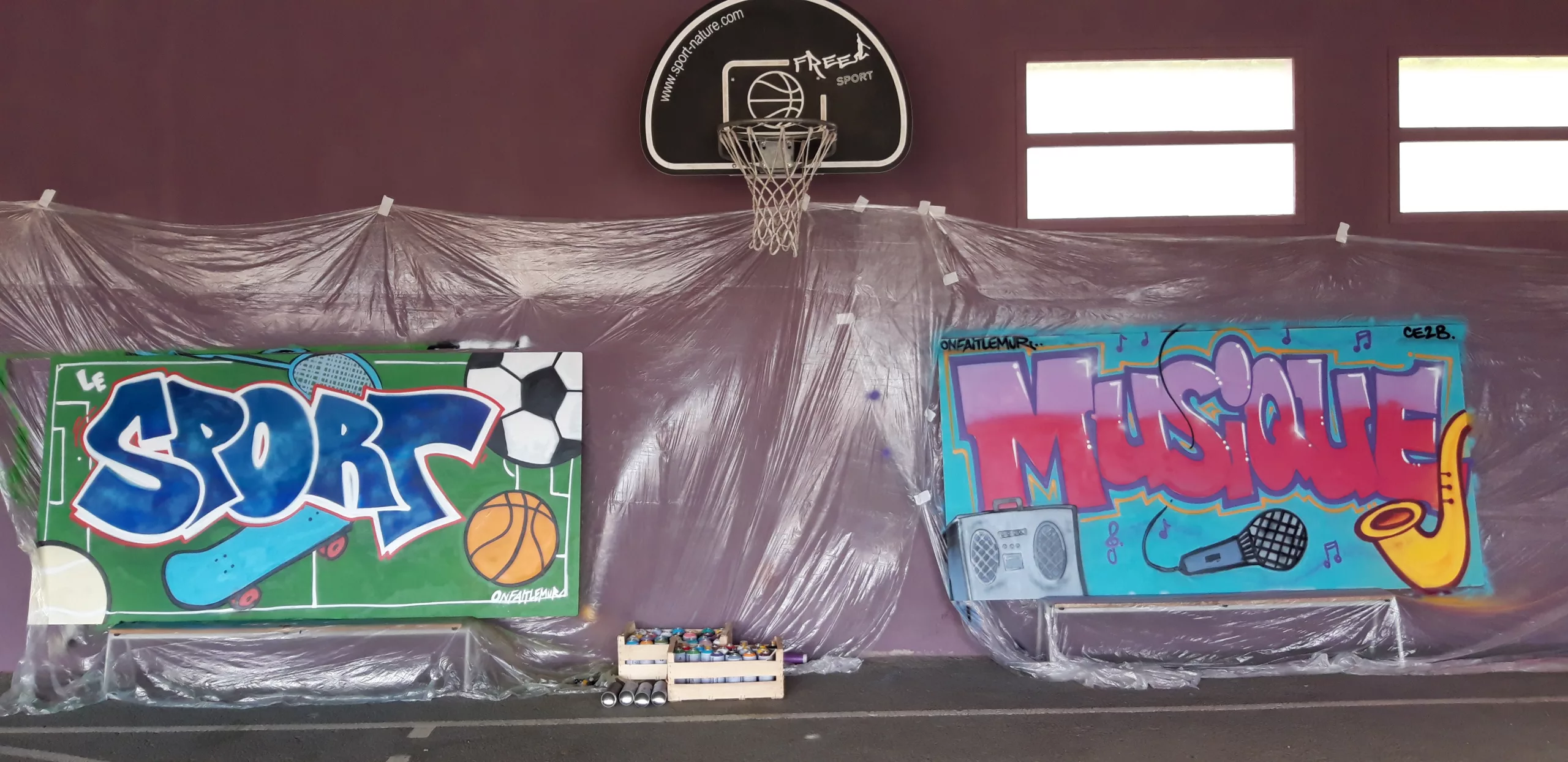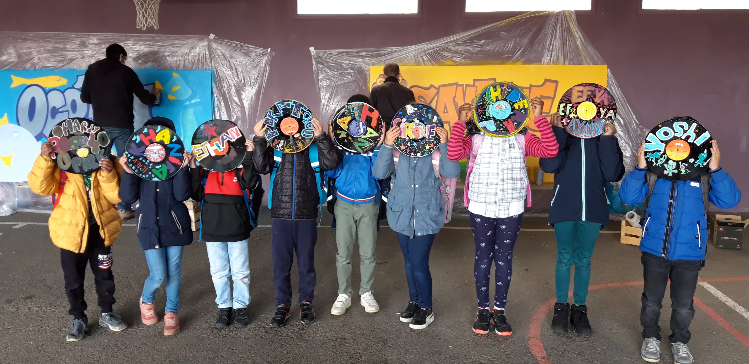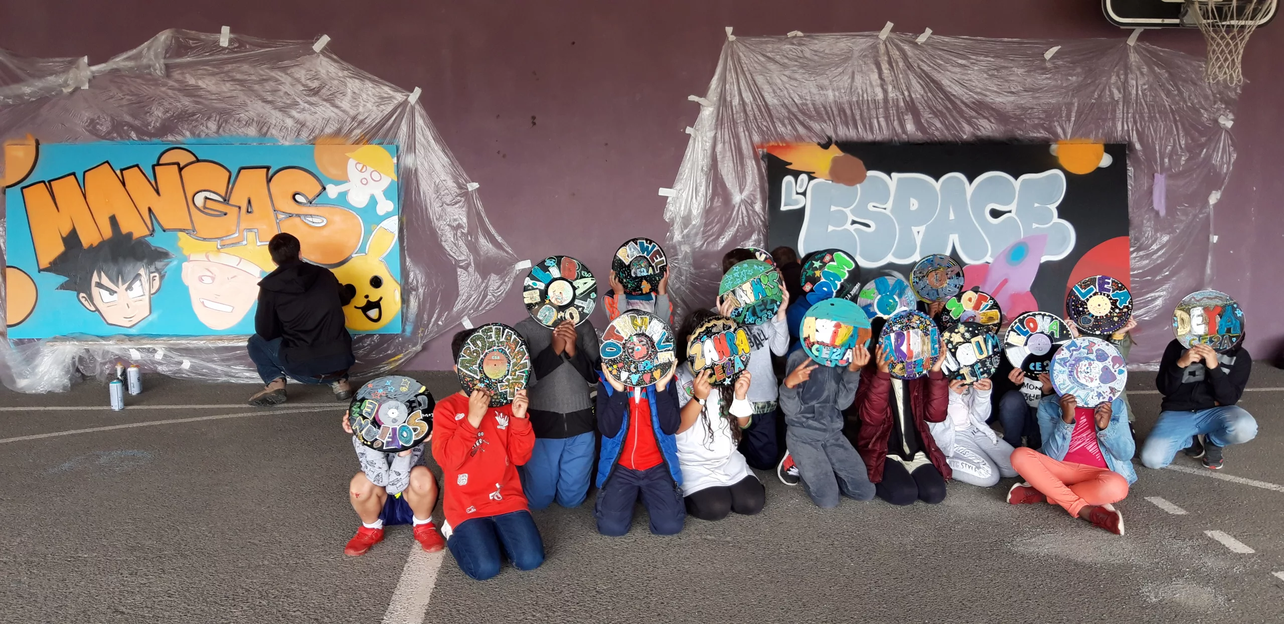 Durant les 2 premiers jours, découverte de la culture du graff, essais sur papier et réalisations sur vinyles*, propositions et choix collectifs de la thématique de la fresque. La dernière matinée, a été consacrée à la réalisation (à 50 mains) de la fresque.
