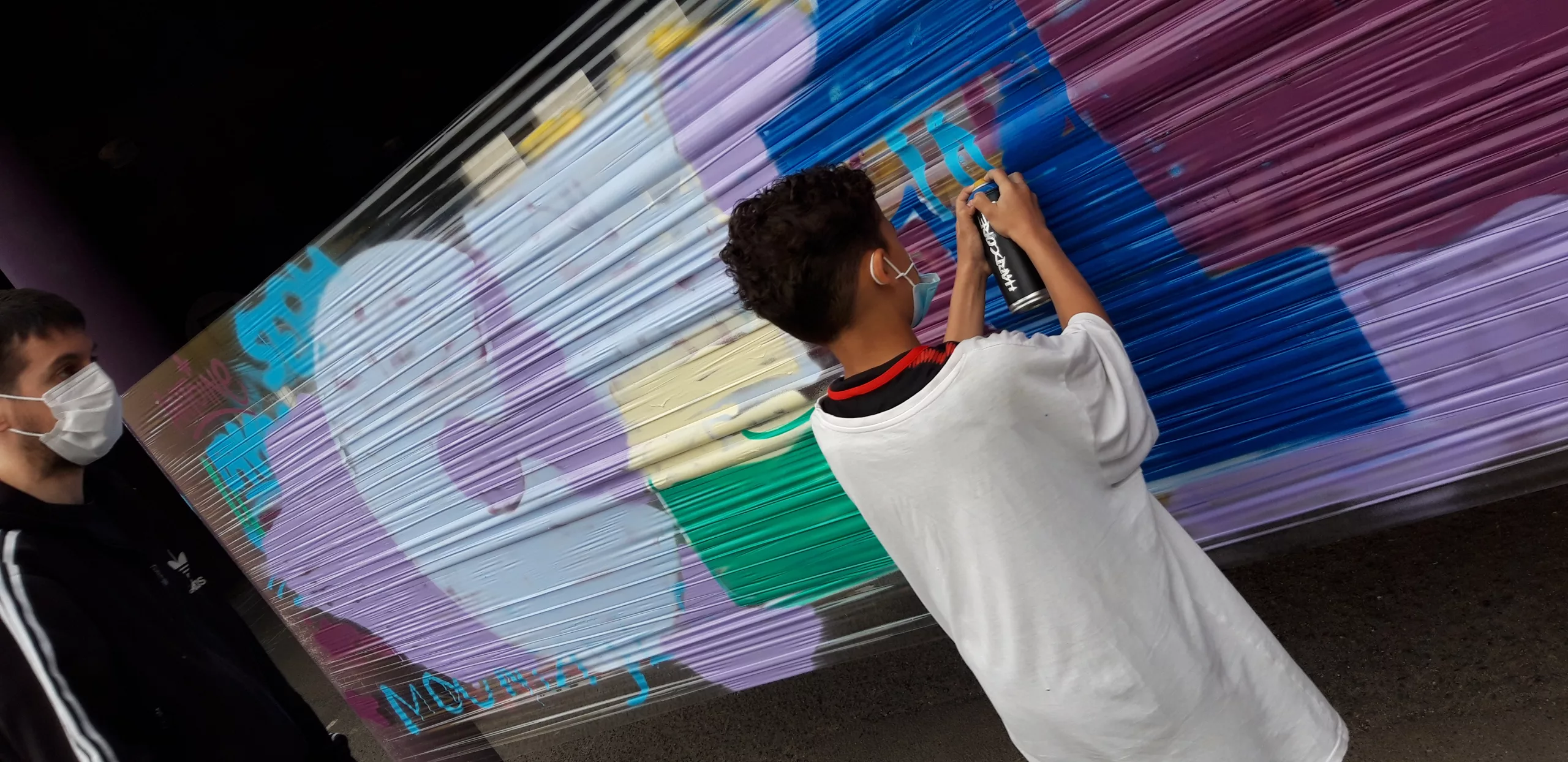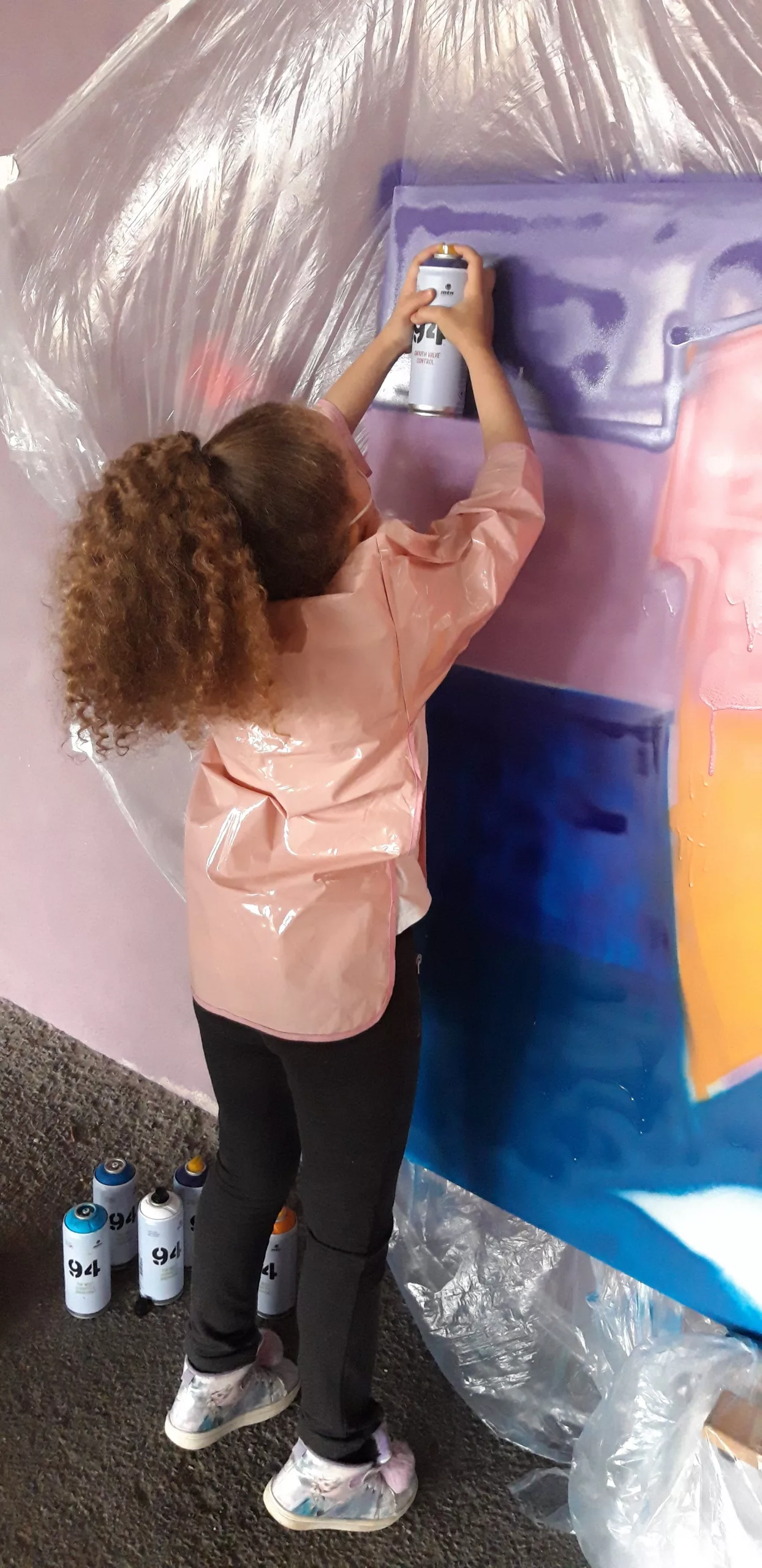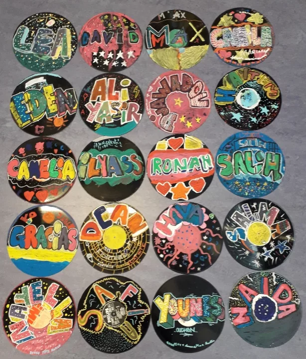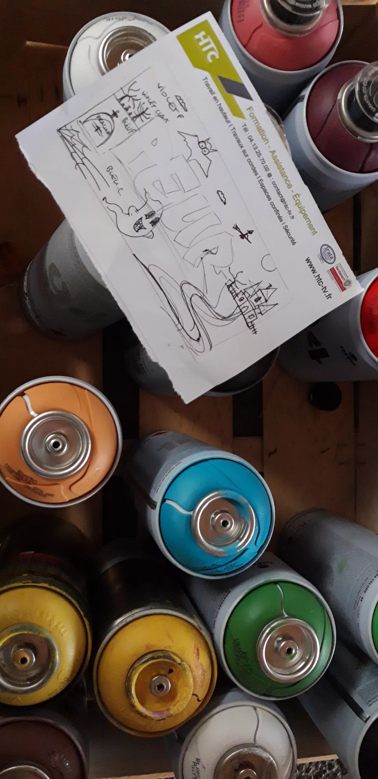 Durant les 2 premiers jours, découverte de la culture du graff, essais sur papier et réalisations sur vinyles*, propositions et choix collectifs de la thématique de la fresque. La dernière matinée, a été consacrée à la réalisation (à 50 mains) de la fresque.
