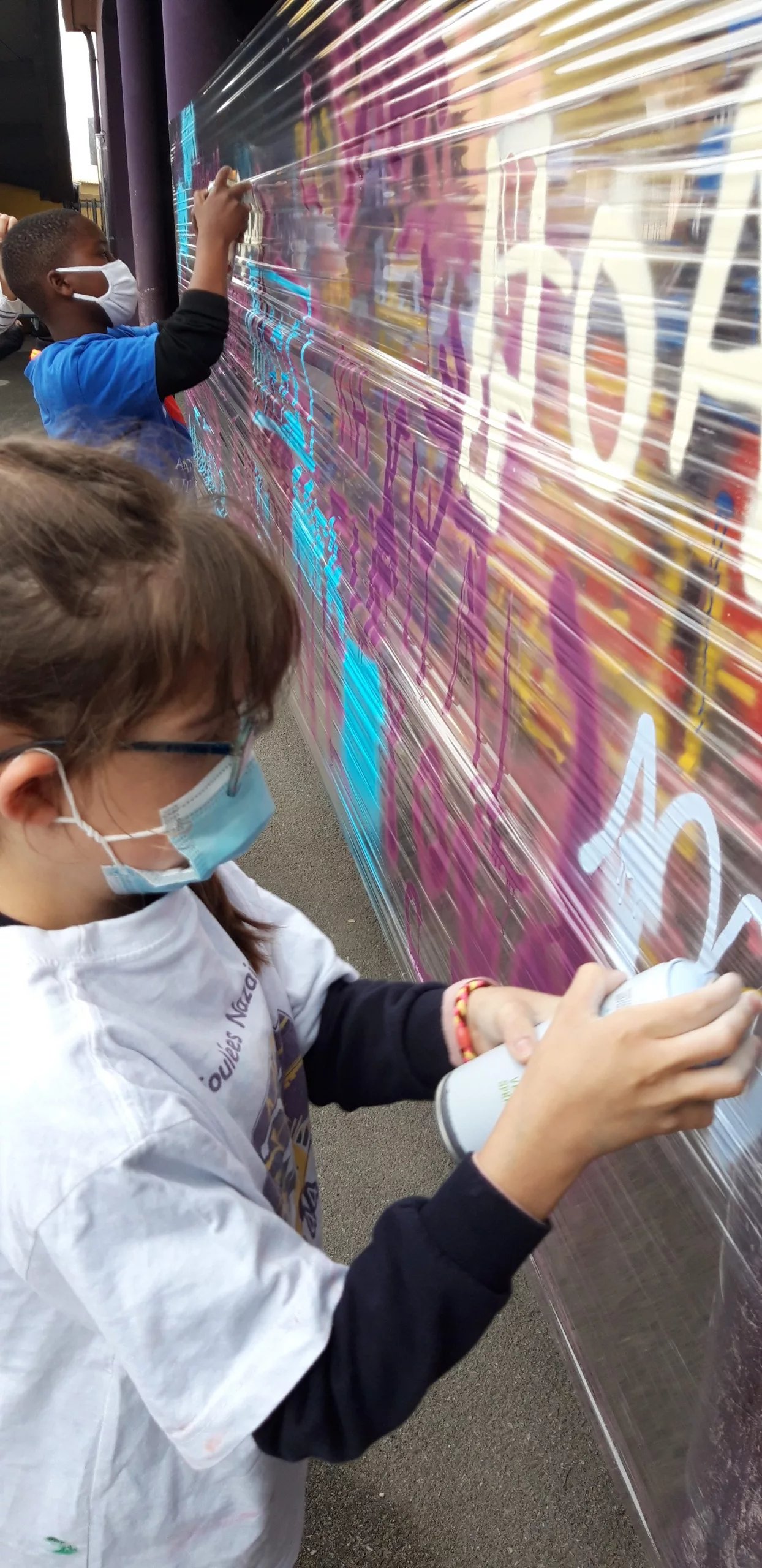 Après une intervention à l’école Michelet, c’est au tour des 4 classes de CE1 et des 2 classes de CE2 de l’école Réberioux de s’initier aux graffs avec l’association nazairienne On Fait Le Mur.