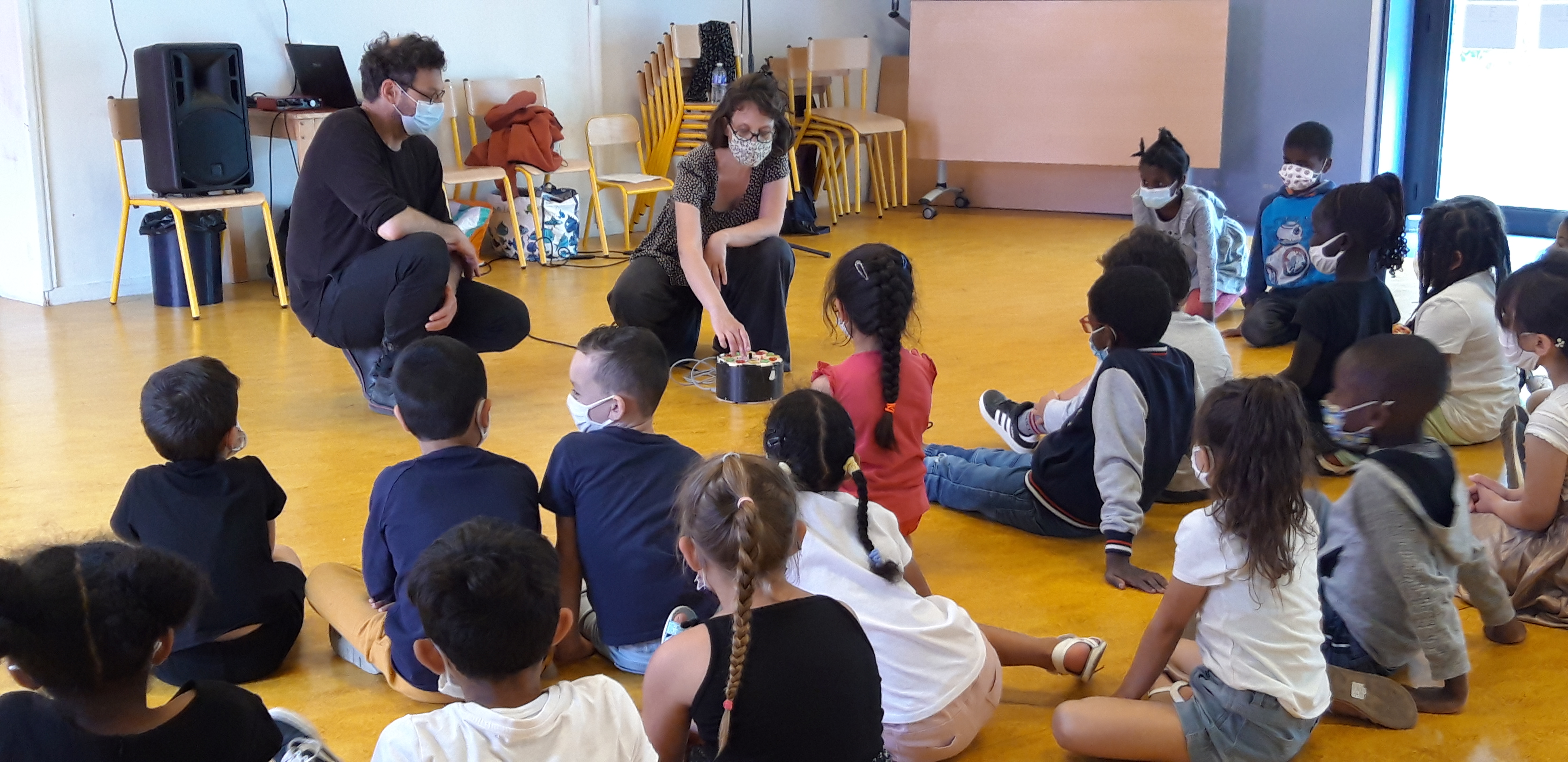 Les 3 classes de CP ont participé à 2 ateliers de créations de « cartes postales sonores ». Les enfants ont été initiés à la composition radiophonique avec l’enregistrement de sons, paroles et bruits ensuite transformés à l’aide de machines et instruments.