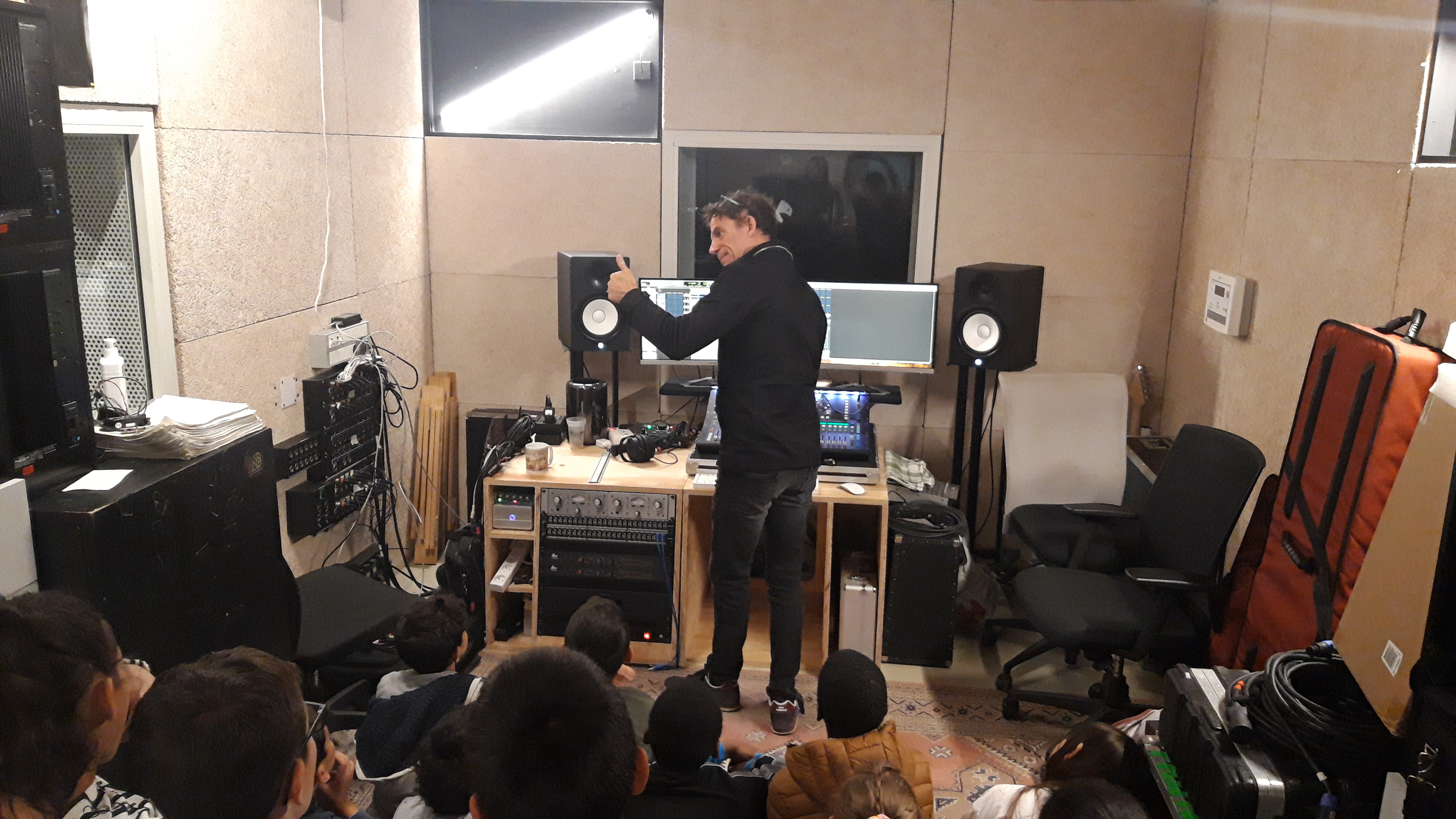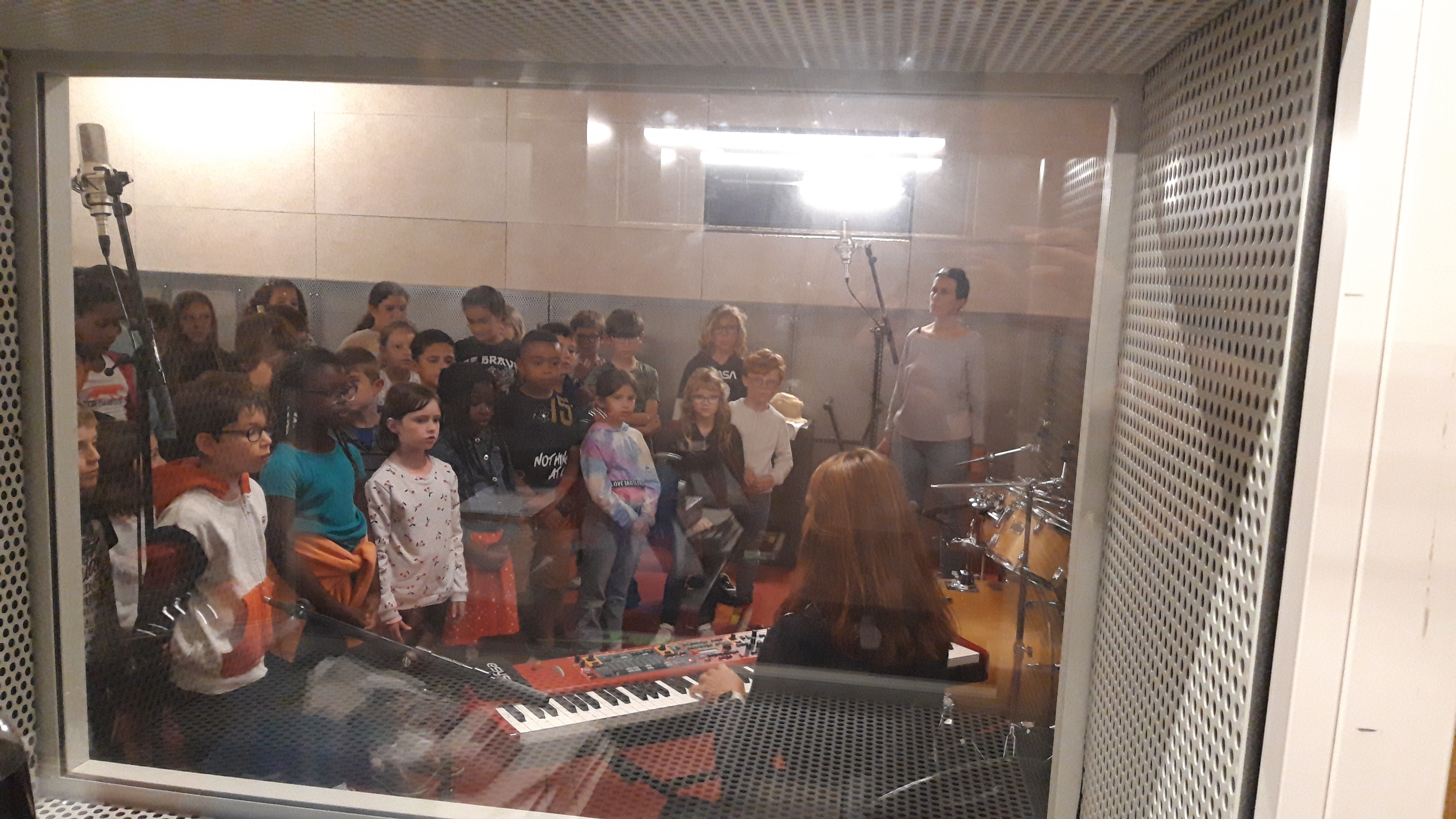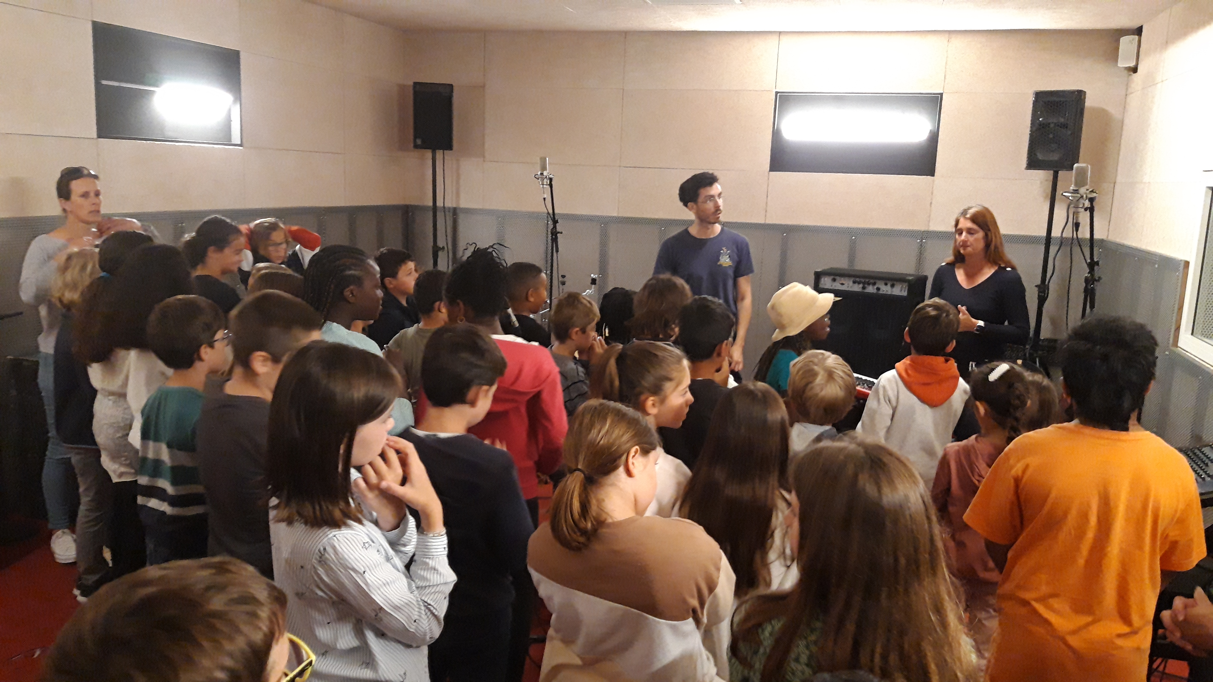 Nous accueillons régulièrement des classes dans les studios pour des enregistrements comme restitution de différents projets de pratique musicale menés dans l’année; Parfois lors d’actions que nous menons de A à Z, en transversalité avec d’autres structures culturelles (PEAC…) ou de demandes spontanées d’équipes pédagogiques/d’animation. A but pédagogique, ces moments permettent de découvrir la rigueur et les techniques d’enregistrements.