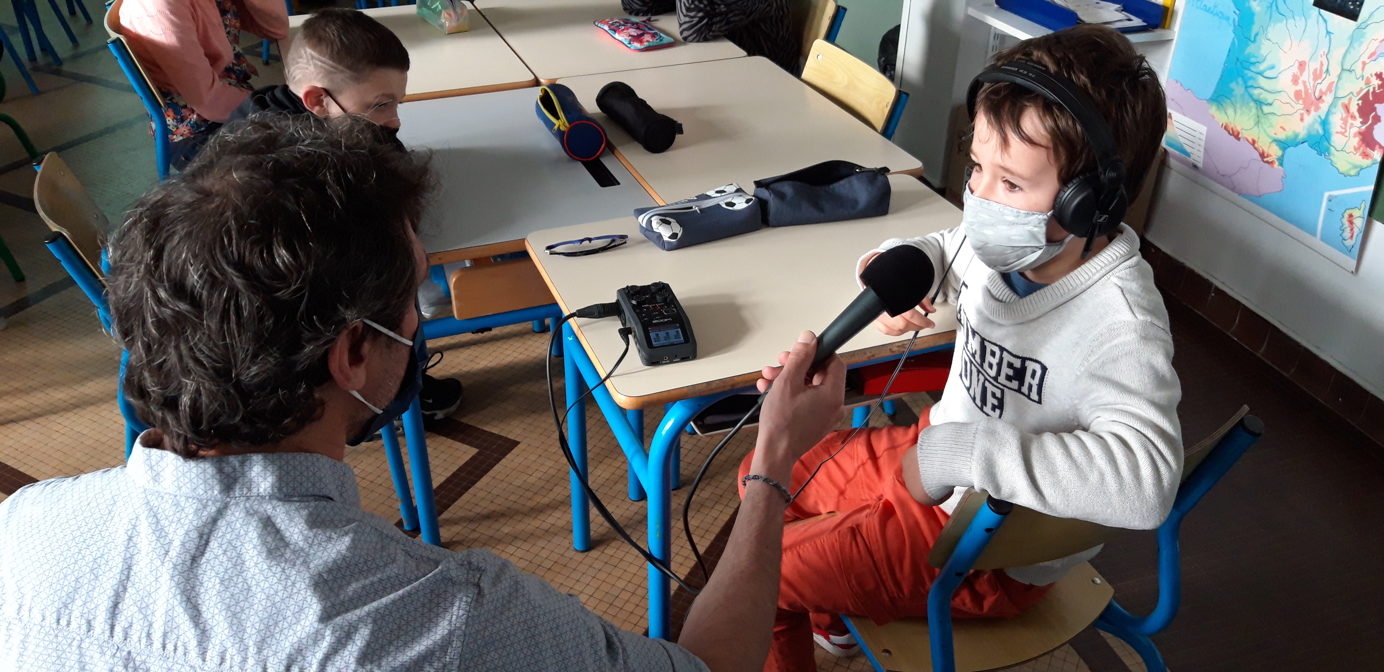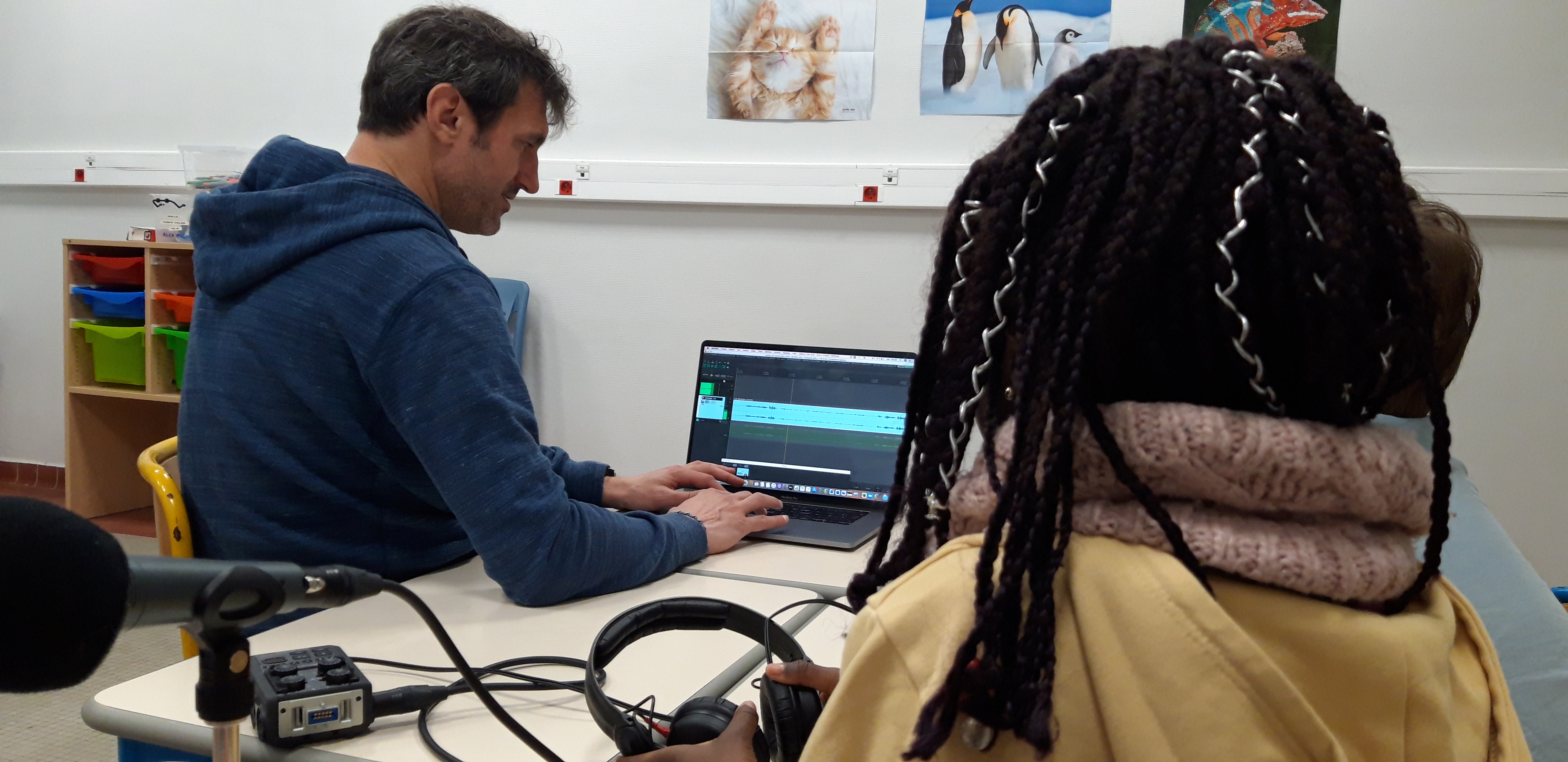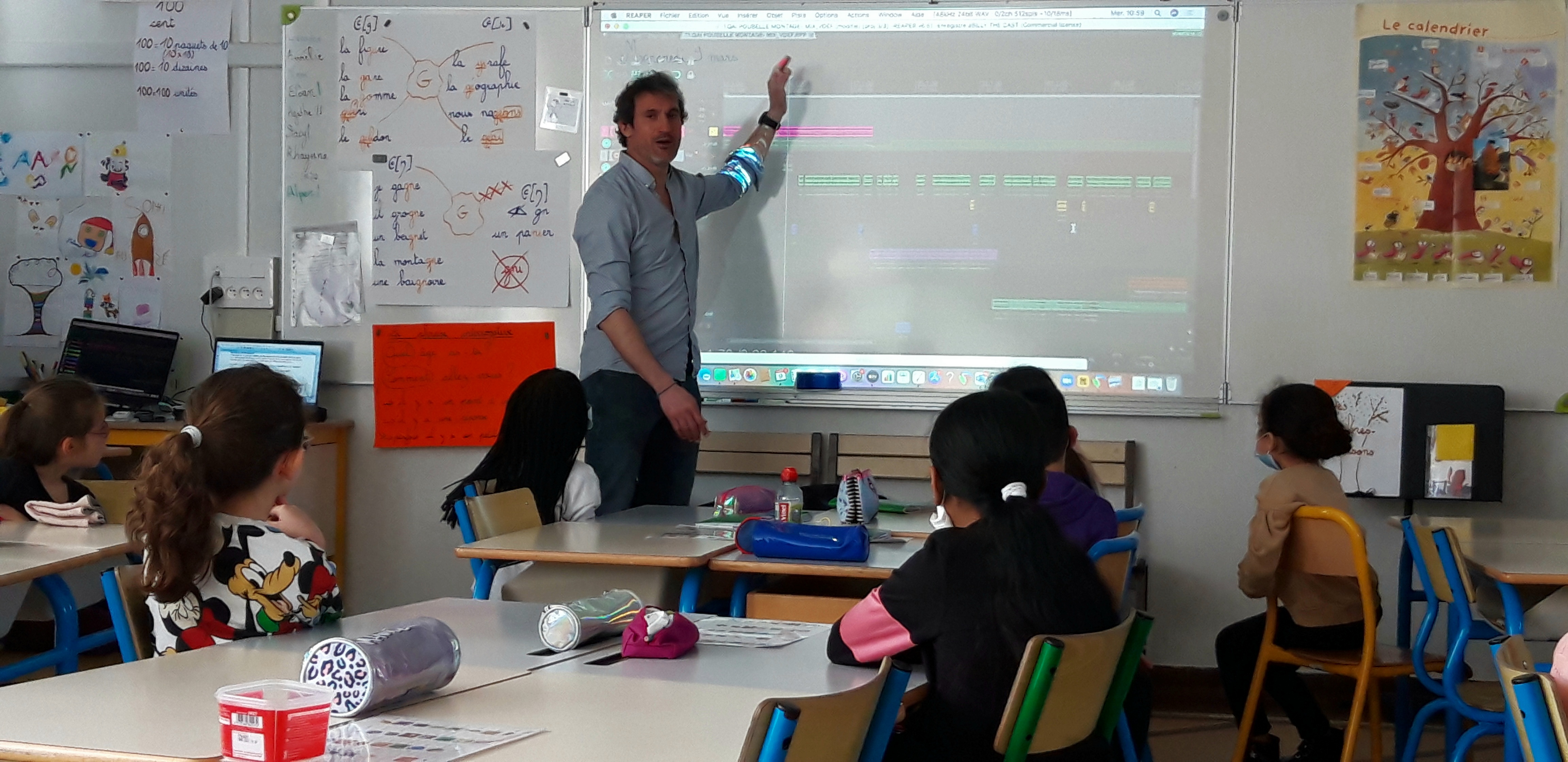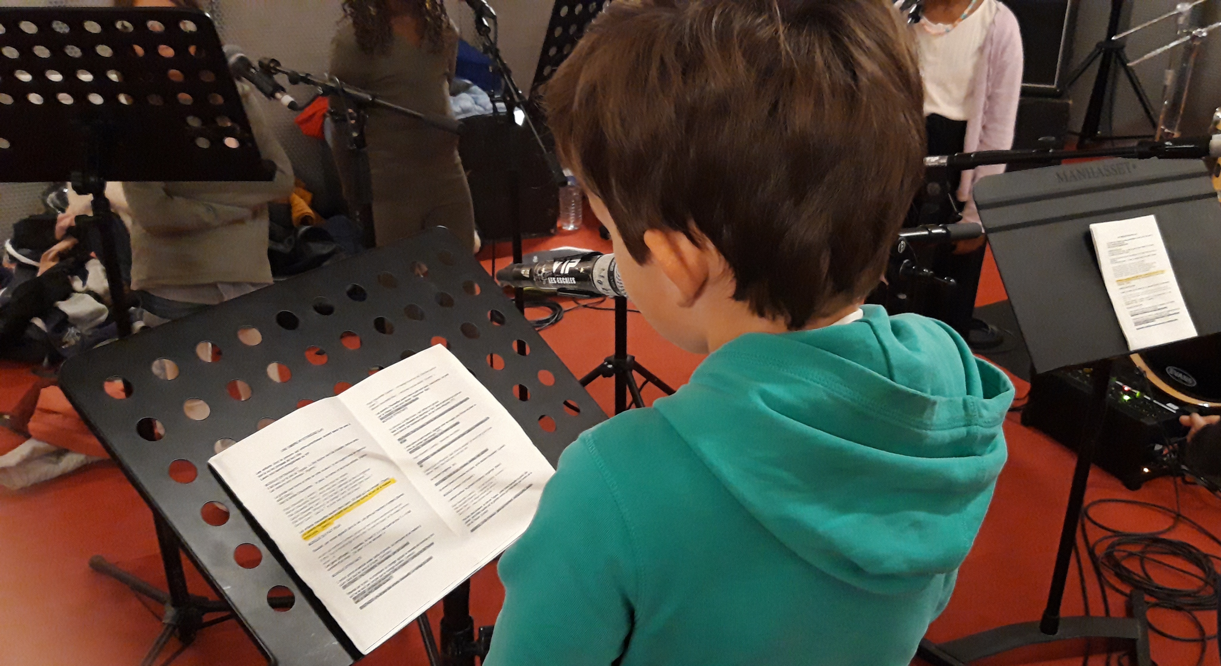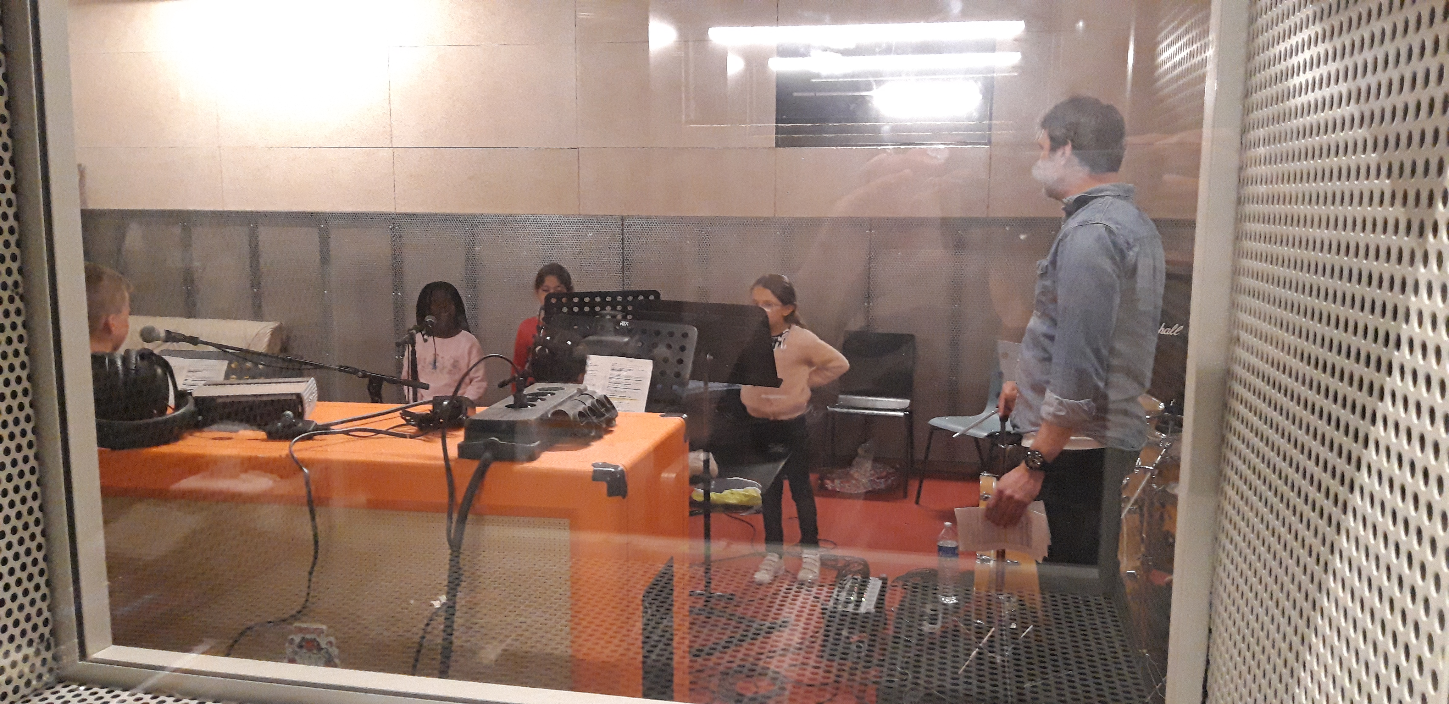 Ce matin, la classe CHAM de l’école Gambetta enregistre avec Florian, animateur aux studios du VIP, la chanson créée pour le projet. Avant l’arrivée des élèves, les enseignant.e.s ont enregistré la partie musicale.