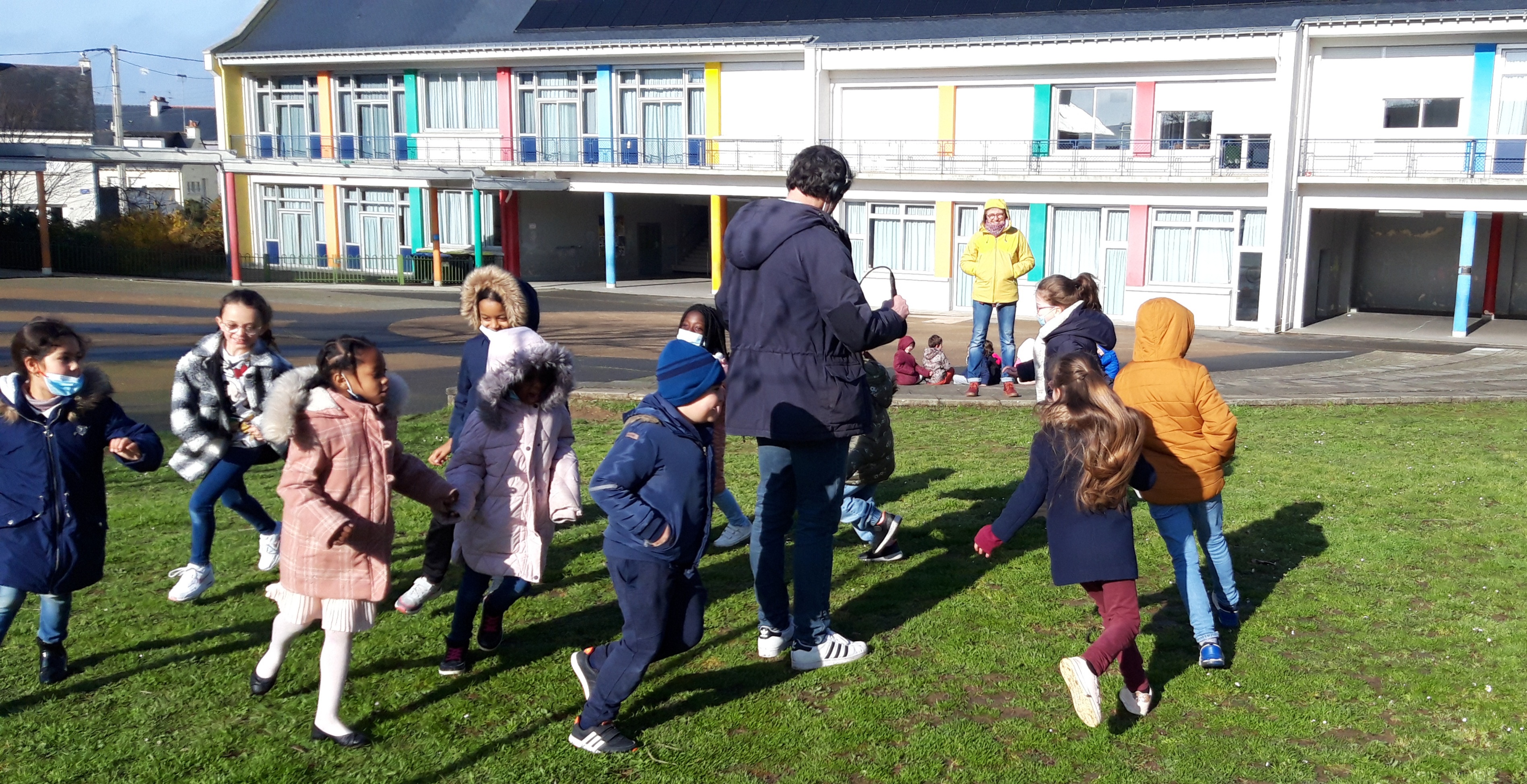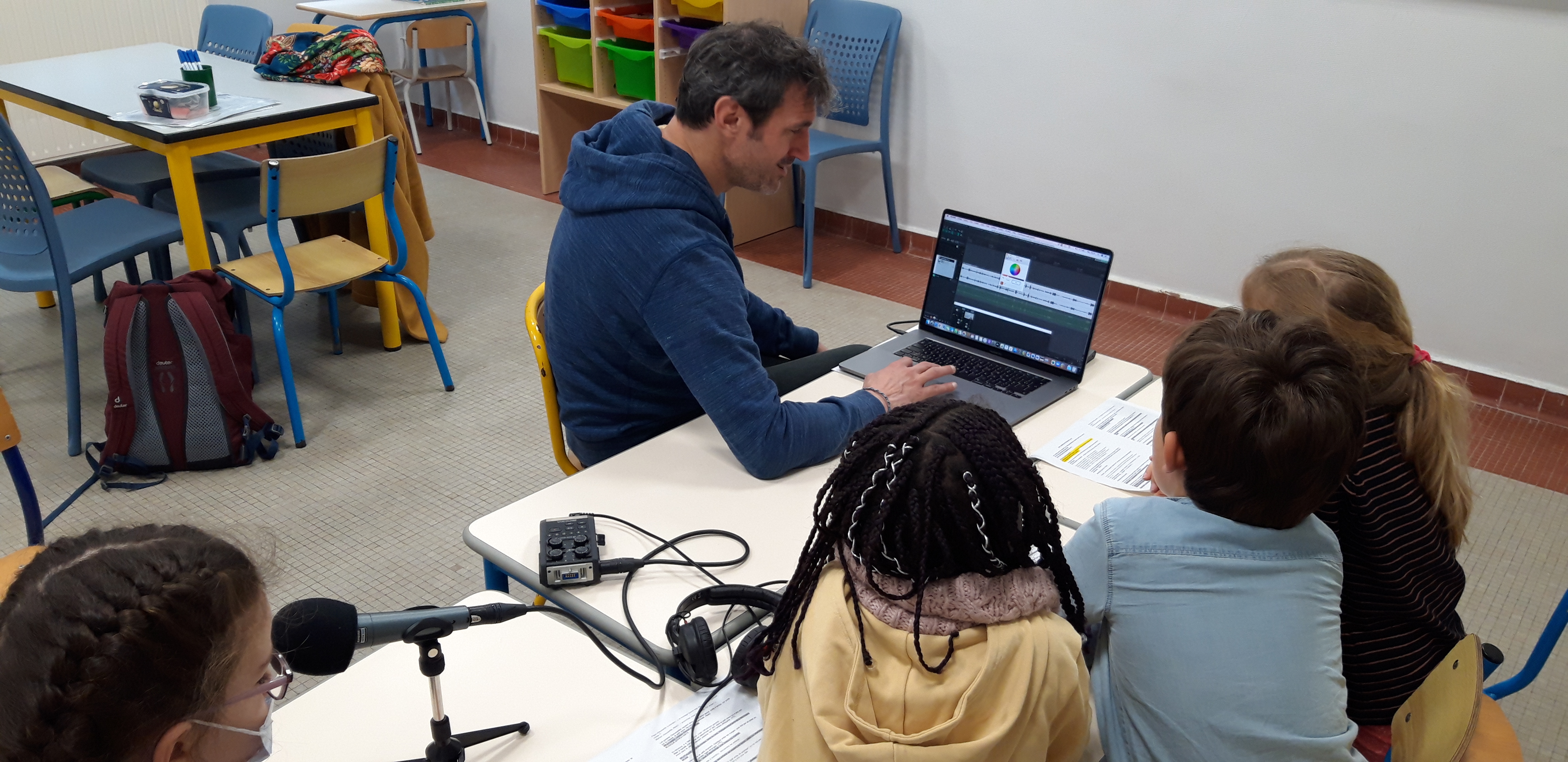 3ème atelier, la dernière fois Julien était reparti avec des devoirs pour présenter la version adaptée au podcast ce matin. Les enfants ont réfléchi aux bruitages et comment imiter un son avec un objet du quotidien (par exemple, un manège avec une essoreuse à salade!), découverts la sonothèque et ses multiples choix pour un même son. Puis présentation de l’enregistreur, micro et casque et de leur fonctionnement. Puis petits exercices, découverte du fonctionnement de la voix, de la respiration pour apprendre à bien parler dans un micro. Après les tests, hop! tous dans la cours pour commencer les captations sonores (manège, ombre qui arrive, fête foraine) puis retour en classe pour une écoute collective. A leur tour, la maitresse et les enfants avaient pour mission de trouver de nouvelles idées pour la séance prochaine!