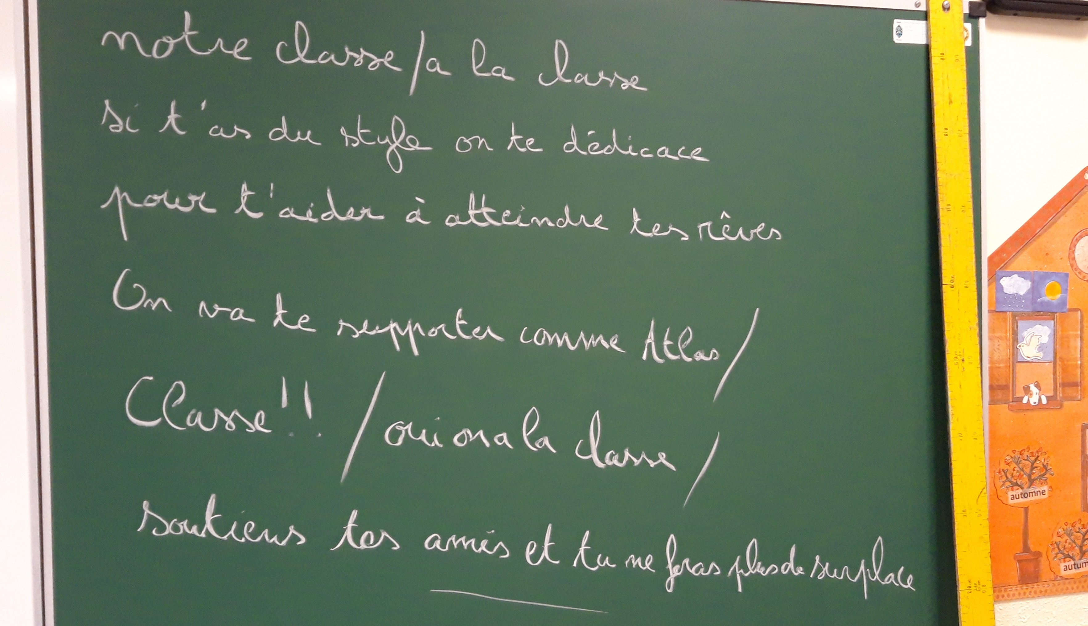 Rhida, comme un grand frère, a partagé son univers et son parcours en transformant la salle de classe en salle de concert le temps d’un ou deux morceaux à chaque séance, mené un travail préparatoire avec un mur de mots en lien avec la thématique du harcèlement, des entrainements à l’écriture, des jeux vocaux, d’interprétation et de gestuels.