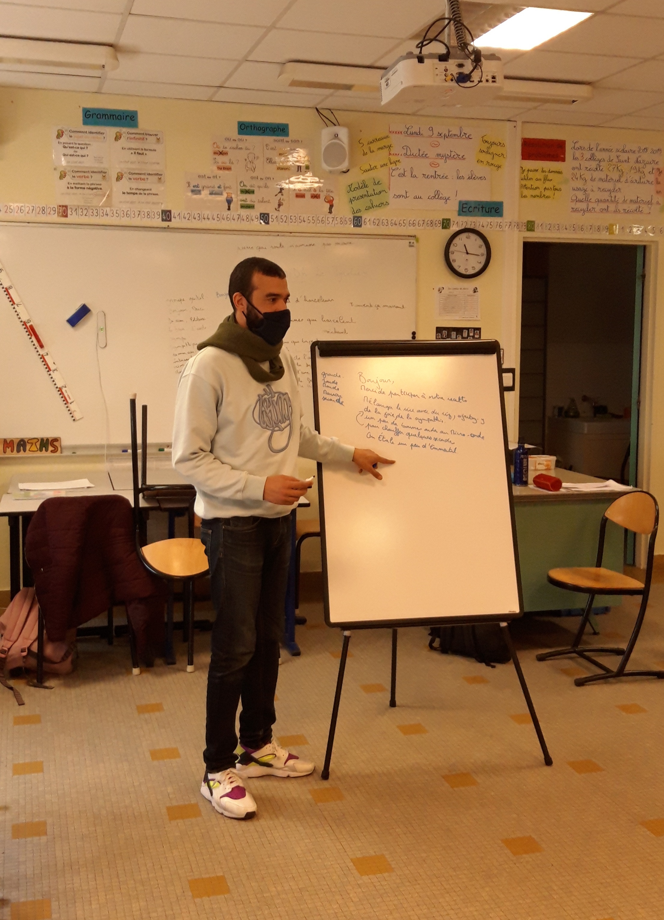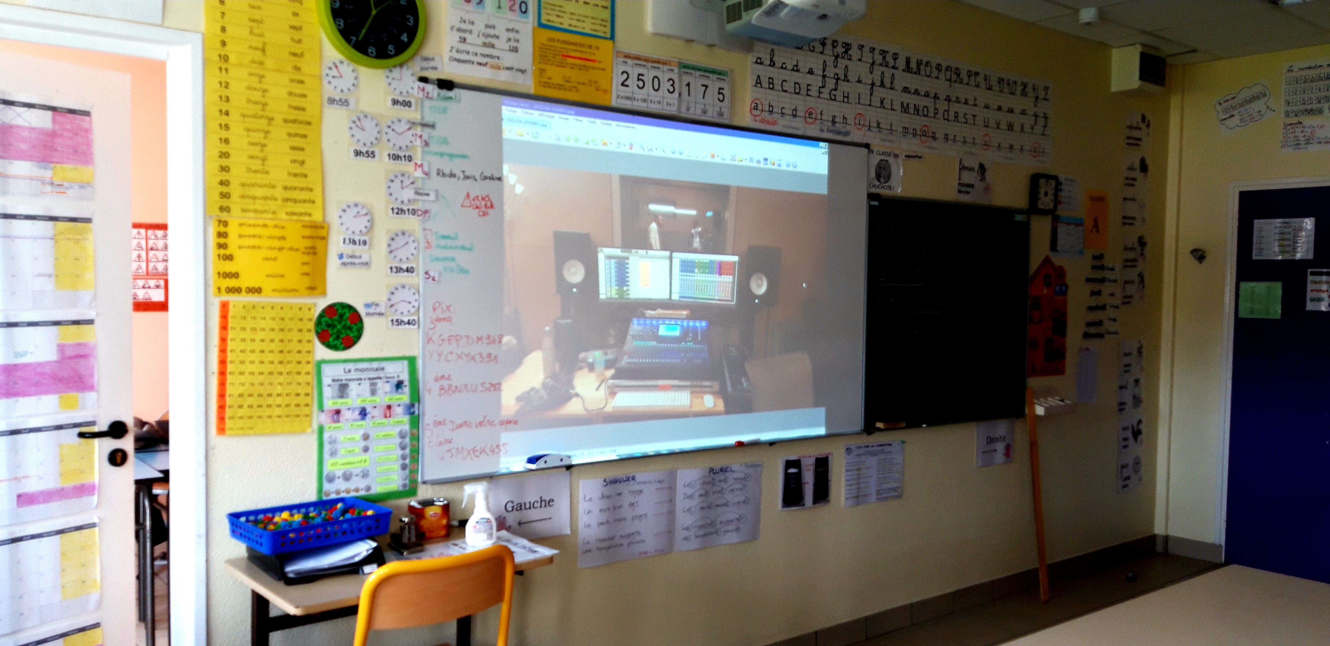 Début février, avec Joris nous sommes allés en classe pour une écoute collective du morceau. Il a expliqué le long travail réalisé après l’enregistrement, le mix, les effets sur les voix… (Rhida était malade ce jour là et donc absent).