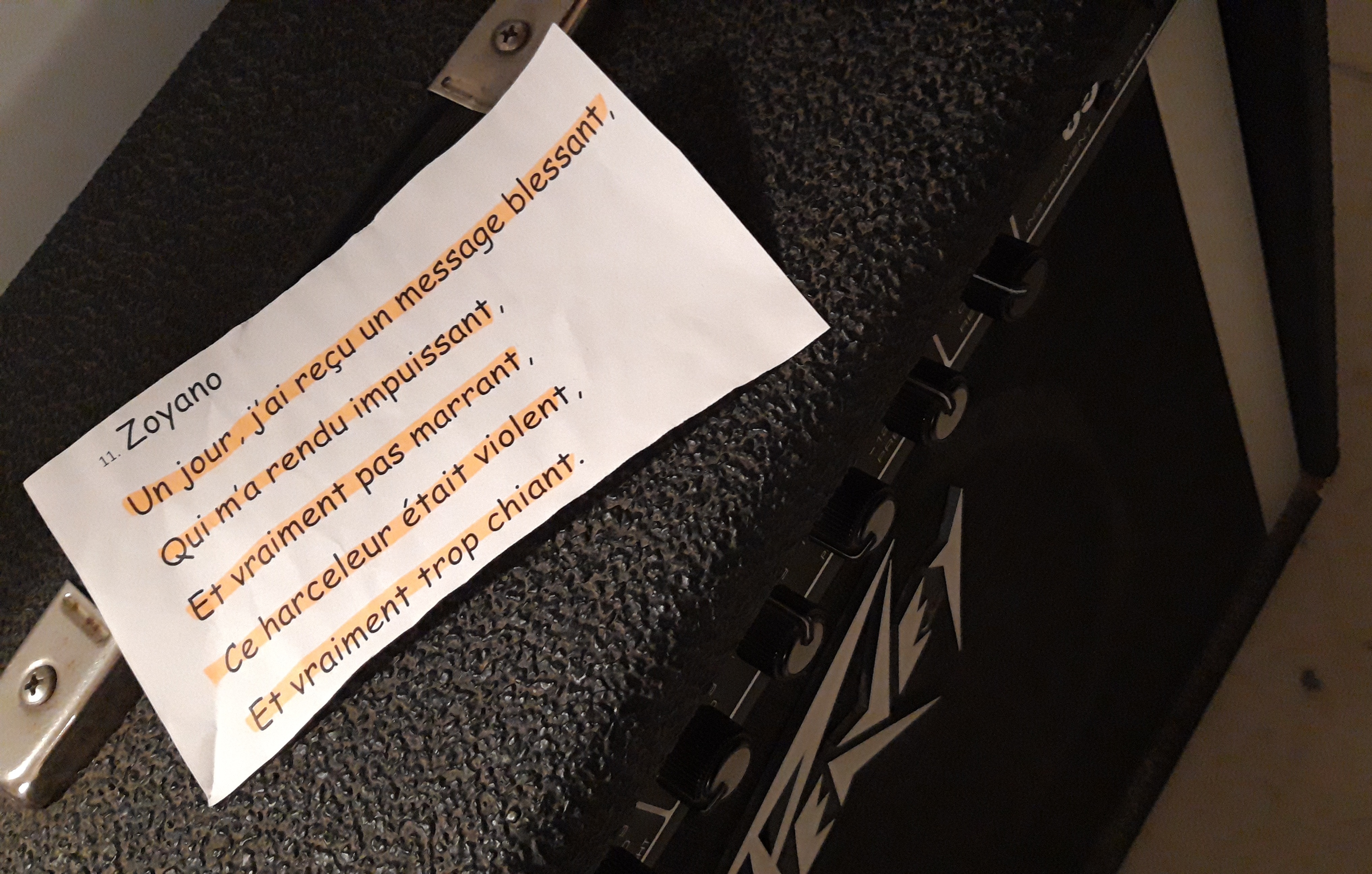 Les élèves avaient pour projet l’écriture un morceau afin de participer un concours national de slam. Durant les 2ères séances, Rhida est intervenu, en soutien au travail réalisé par leur enseignant Anthony HEUZÉ, pour les préparer la création du titre final et à la captation de ce dernier.