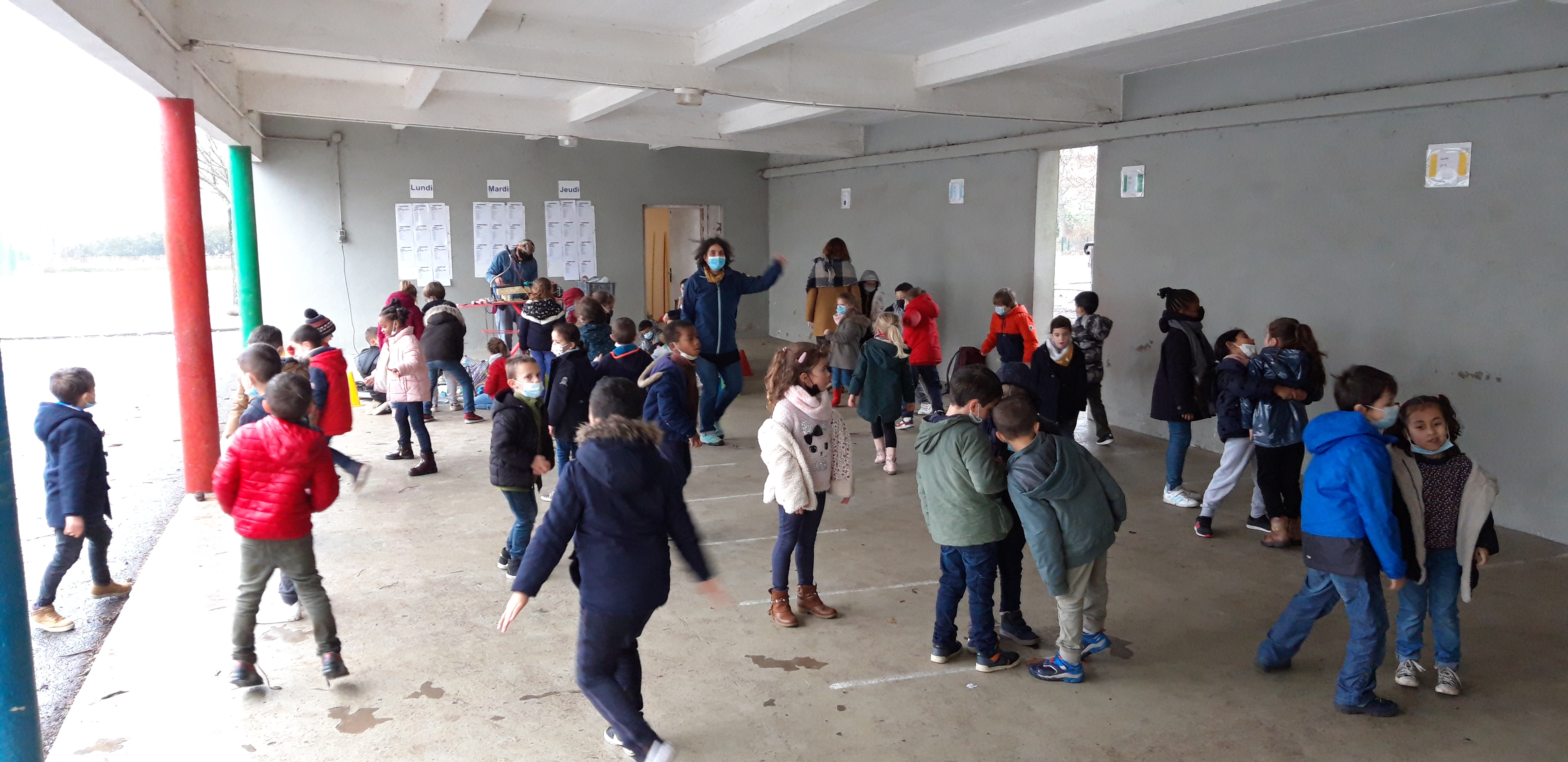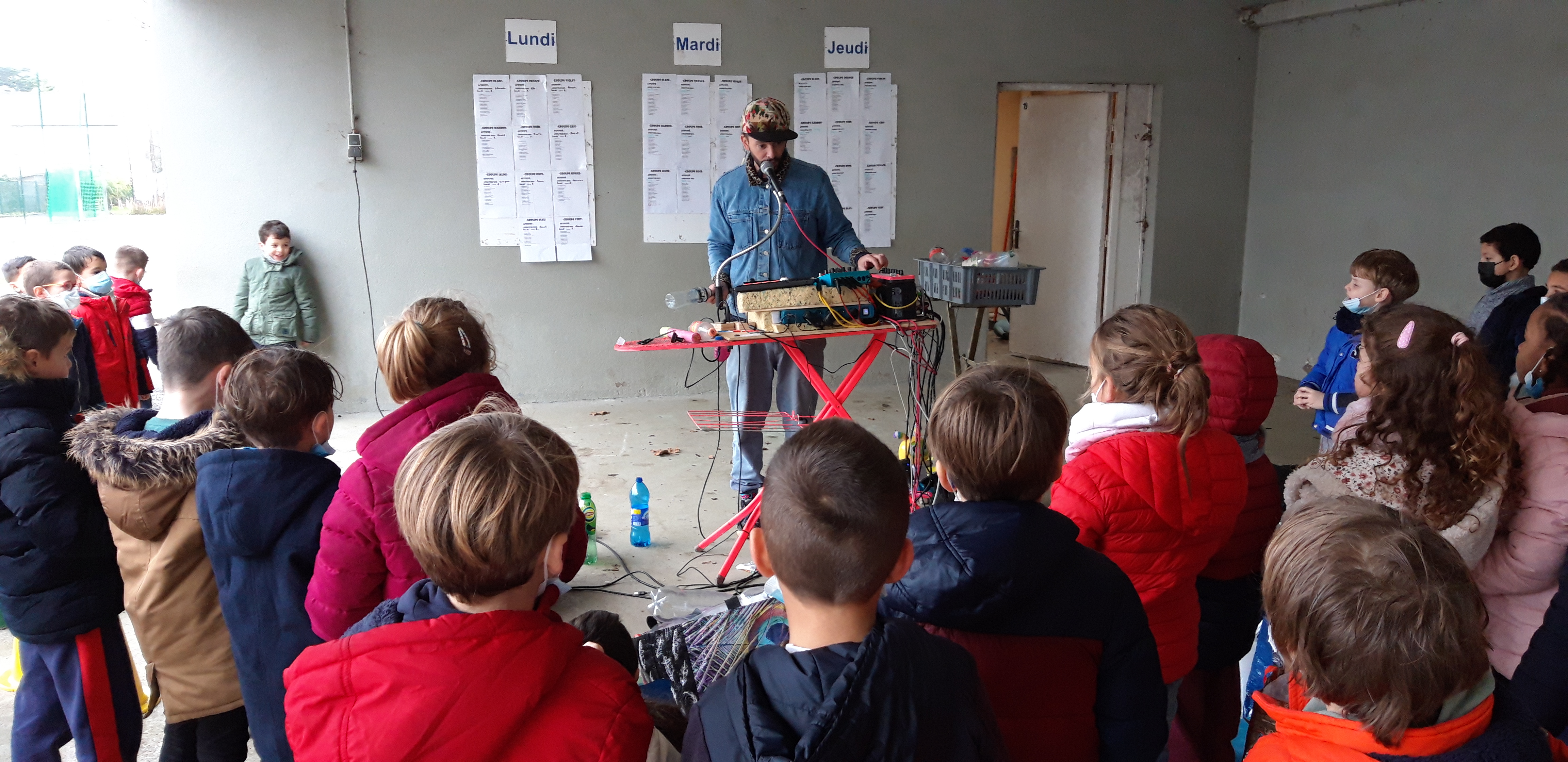 L’année 2002 a commencé sur les chapeaux de roues pour les élèves de l’école Victor Hugo. Le 3 janvier au matin, direction les abords du parc paysager et la soucoupe pour une 2 clean walk géantes pour 5 classes du CP au CE2 et le groupe ULIS! Avant le départ, présentation de Ben, de son projet et ses instruments rigolos. Chaque groupe une fois revenu, a assister à un court concert sous le préau. Lechapus a improvisé de nouveaux sons en piochant dans la récolte de déchets ramenés.
