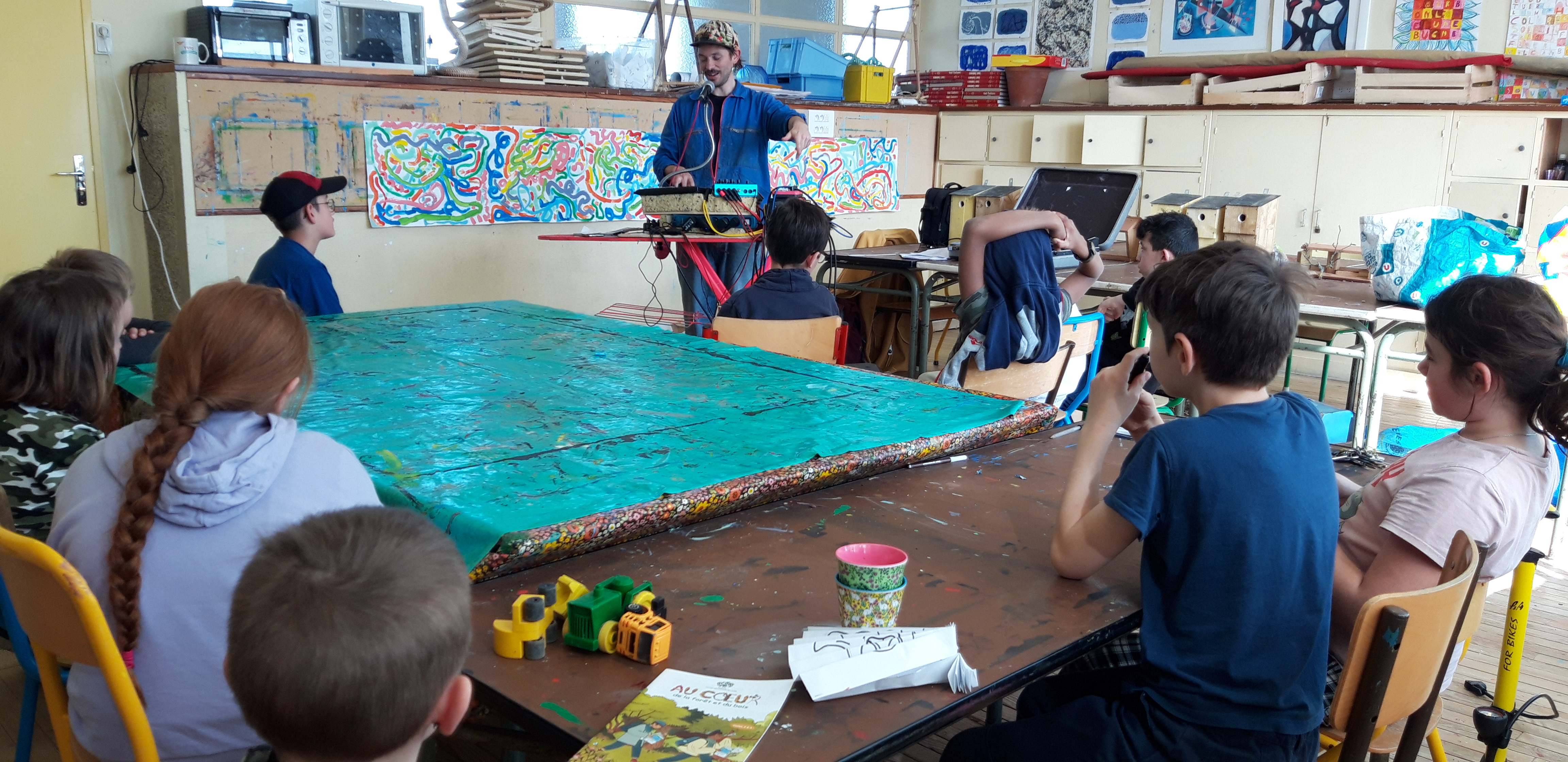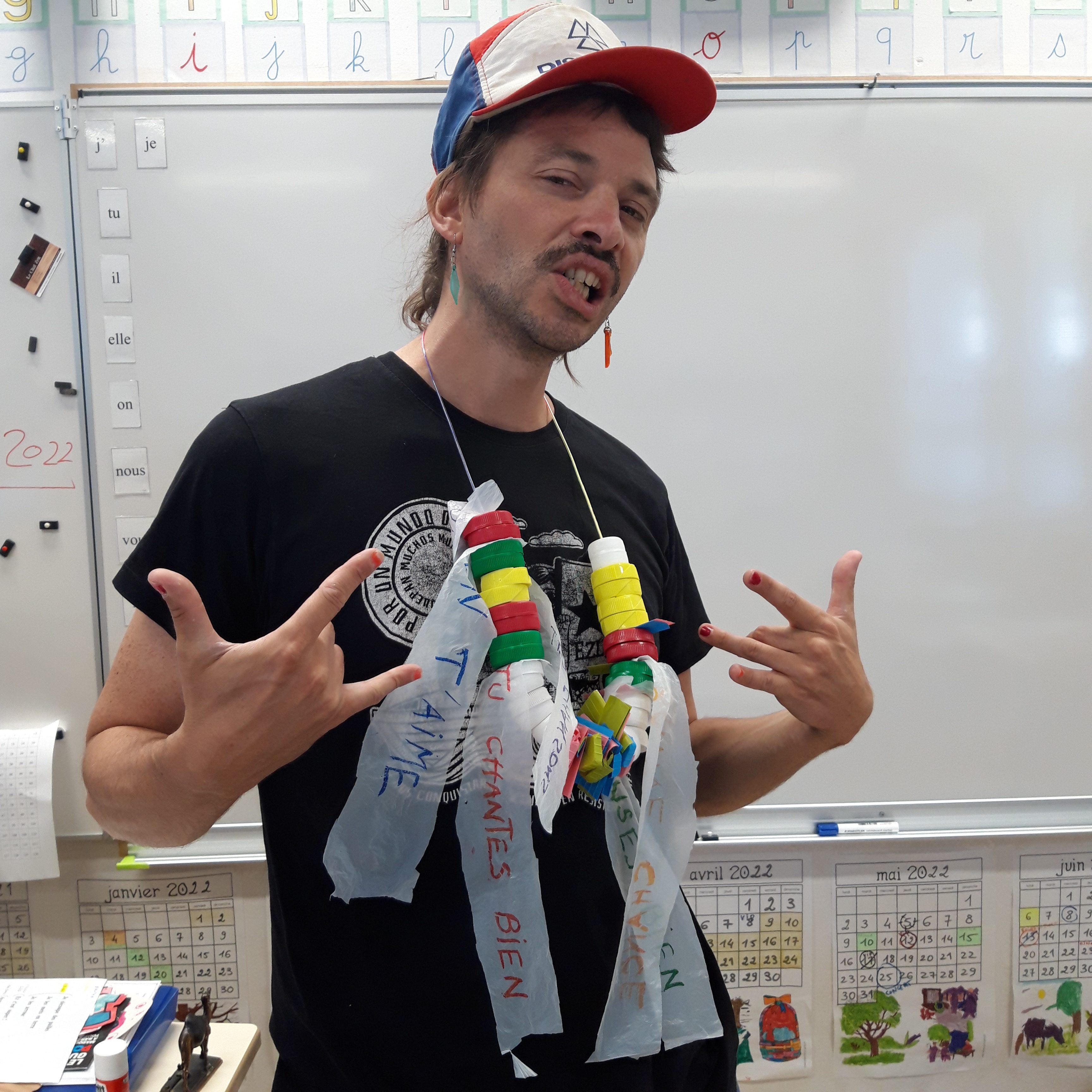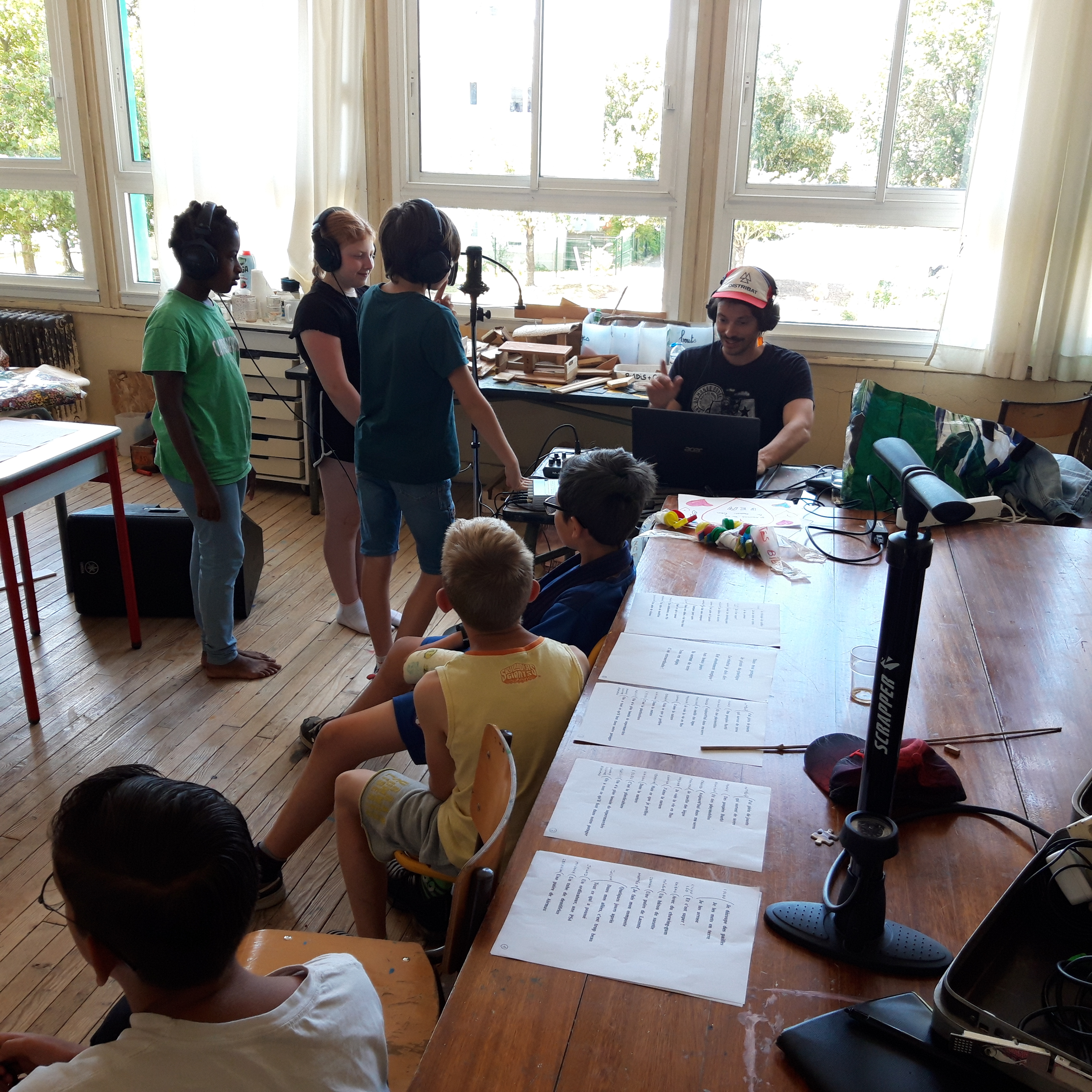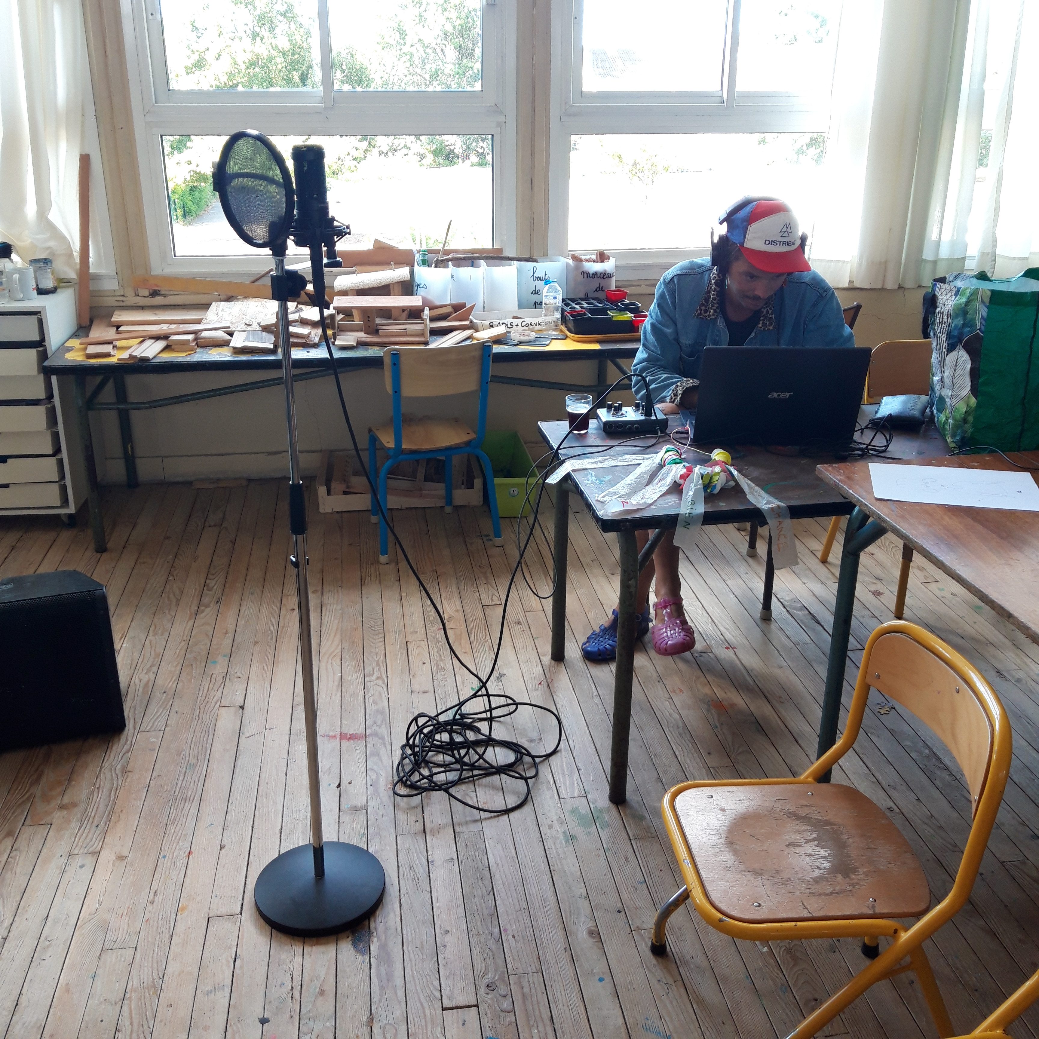 Durant les venues ( 4 séances, 12h) de Ben à l’école, chaque élève de la classe ULIS a construit un cocaphone et une rhombe. Puis à partir d’une composition musicale de Ben, la classe a écrit, collectivement, un morceau en lien avec le plastique. Après plusieurs répétitions et un travail d’interprétation, est venu le temps d’enregistrer le morceau.