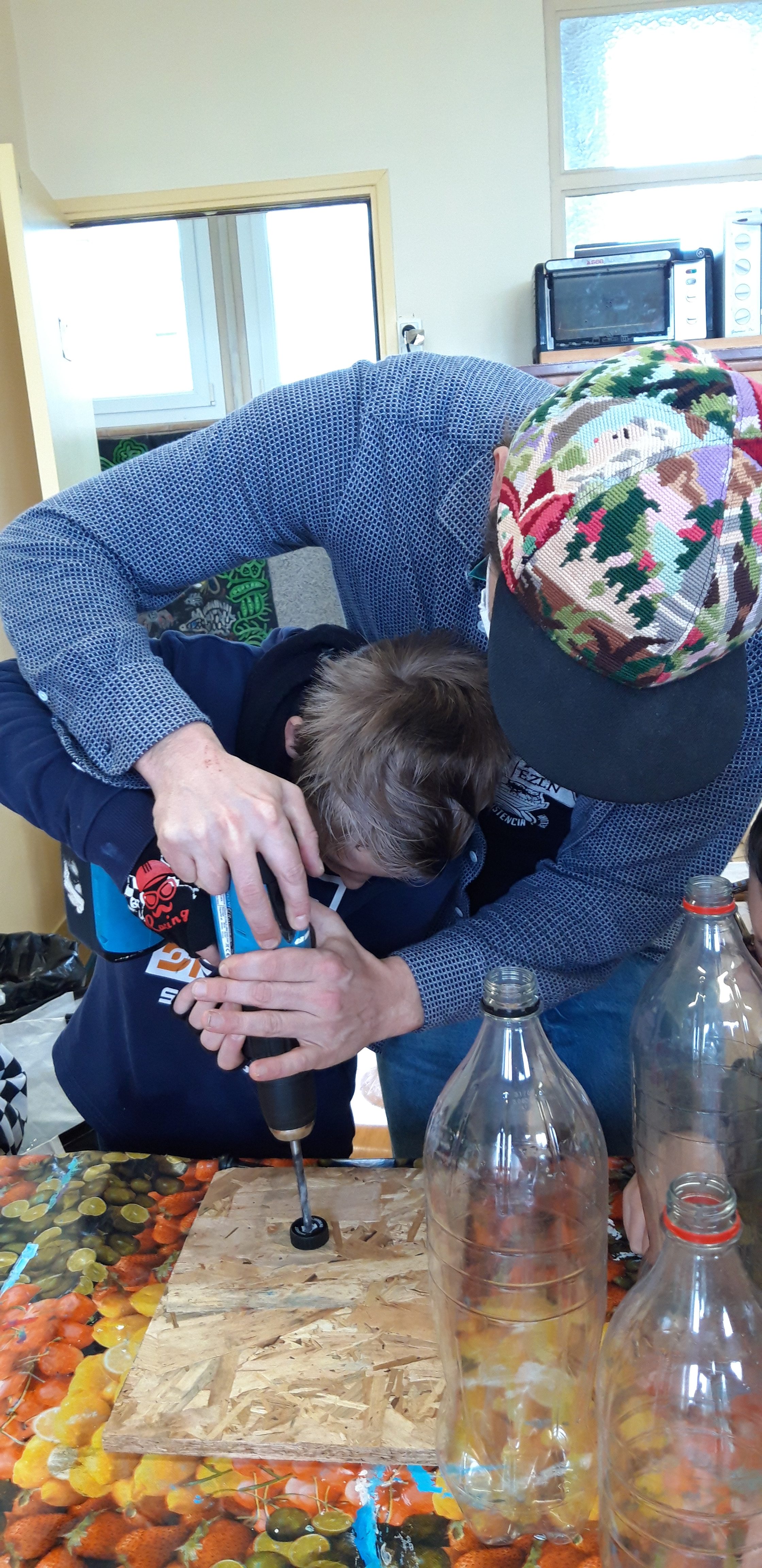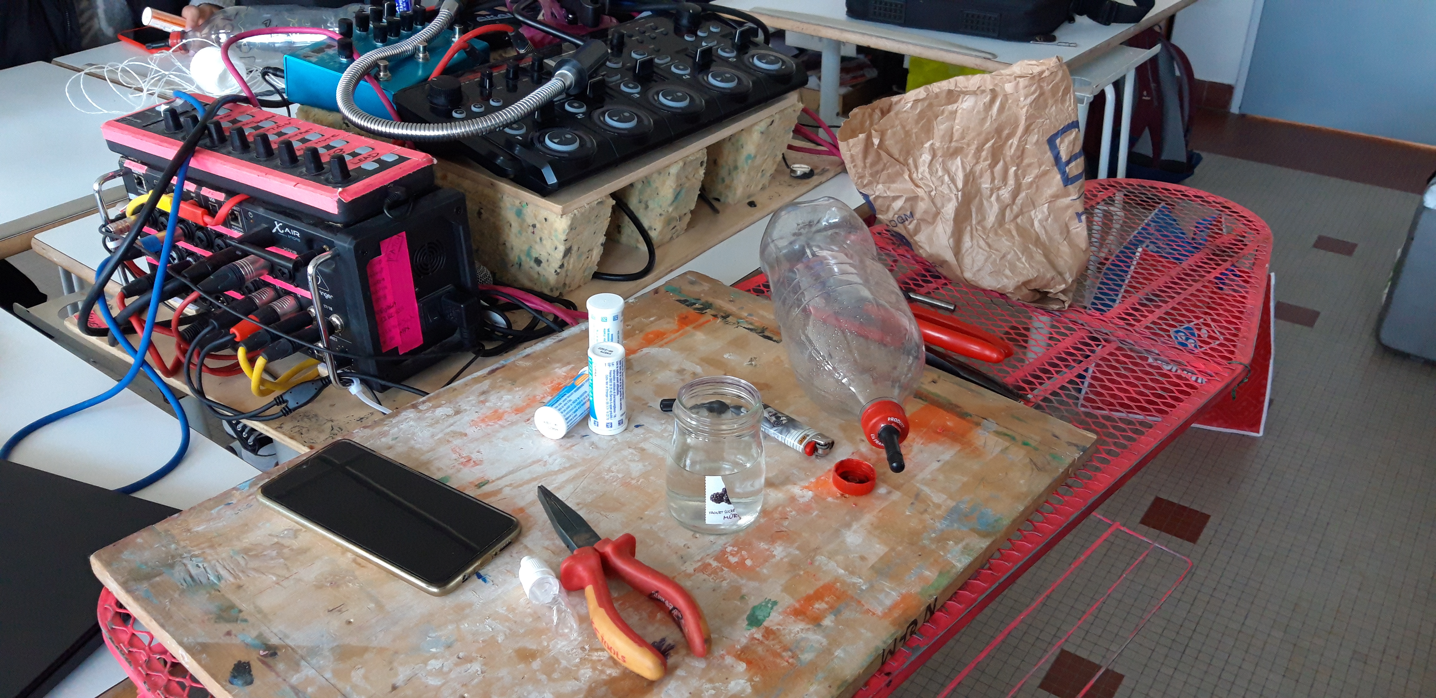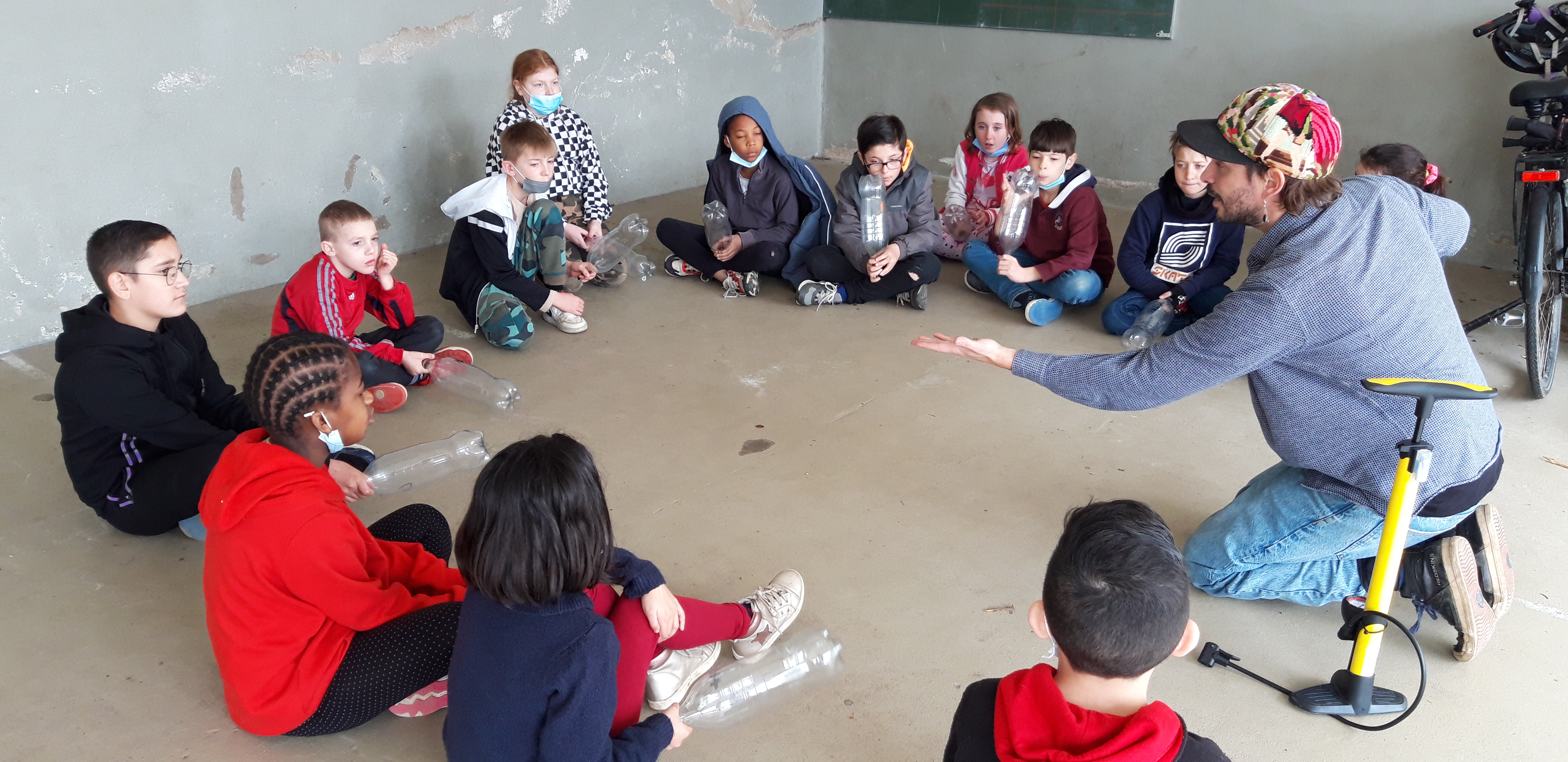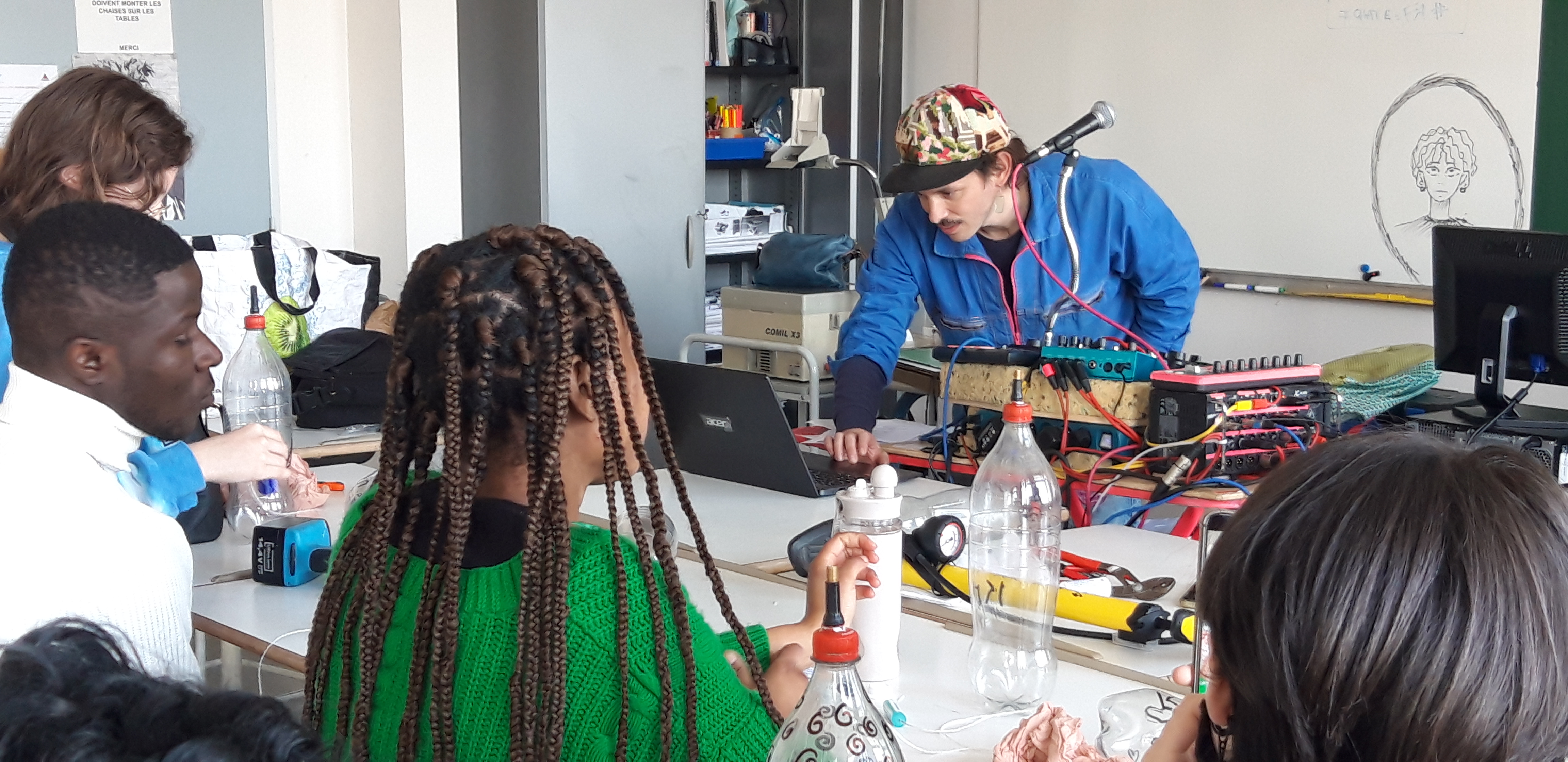 Durant les venues ( 4 séances, 12h) de Ben à l’école, chaque élève de la classe ULIS a construit un cocaphone et une rhombe. Puis à partir d’une composition musicale de Ben, la classe a écrit, collectivement, un morceau en lien avec le plastique. Après plusieurs répétitions et un travail d’interprétation, est venu le temps d’enregistrer le morceau.