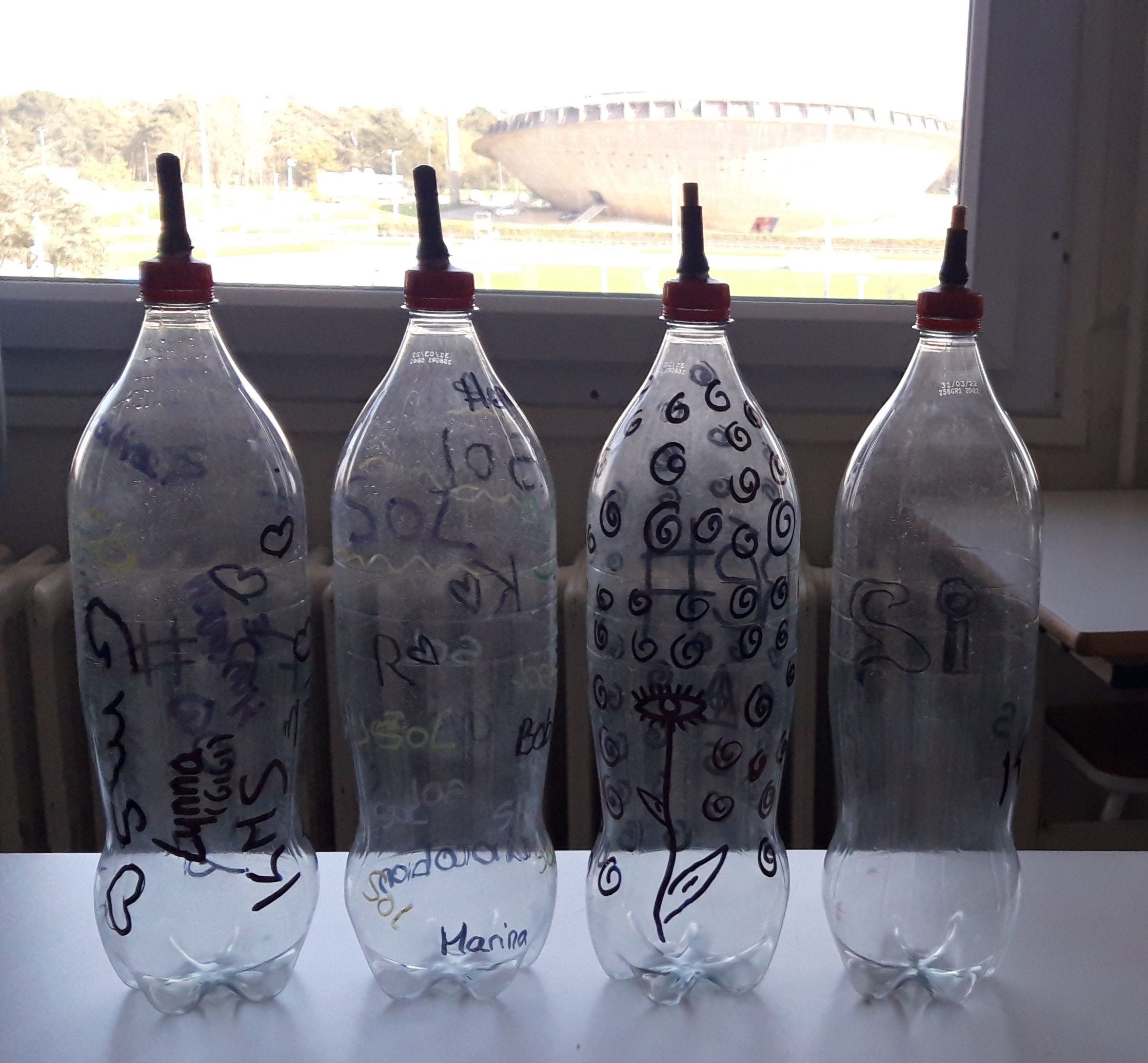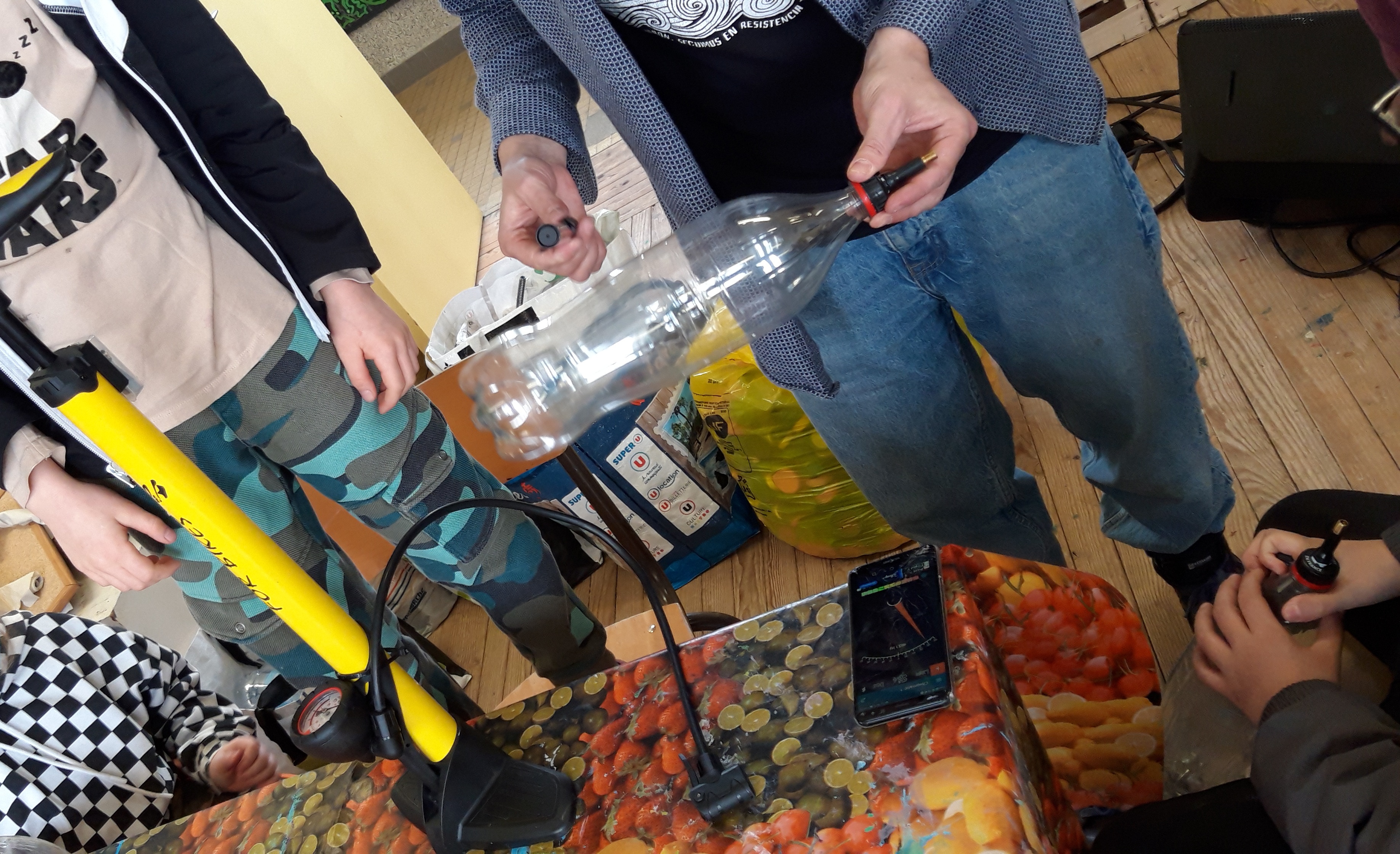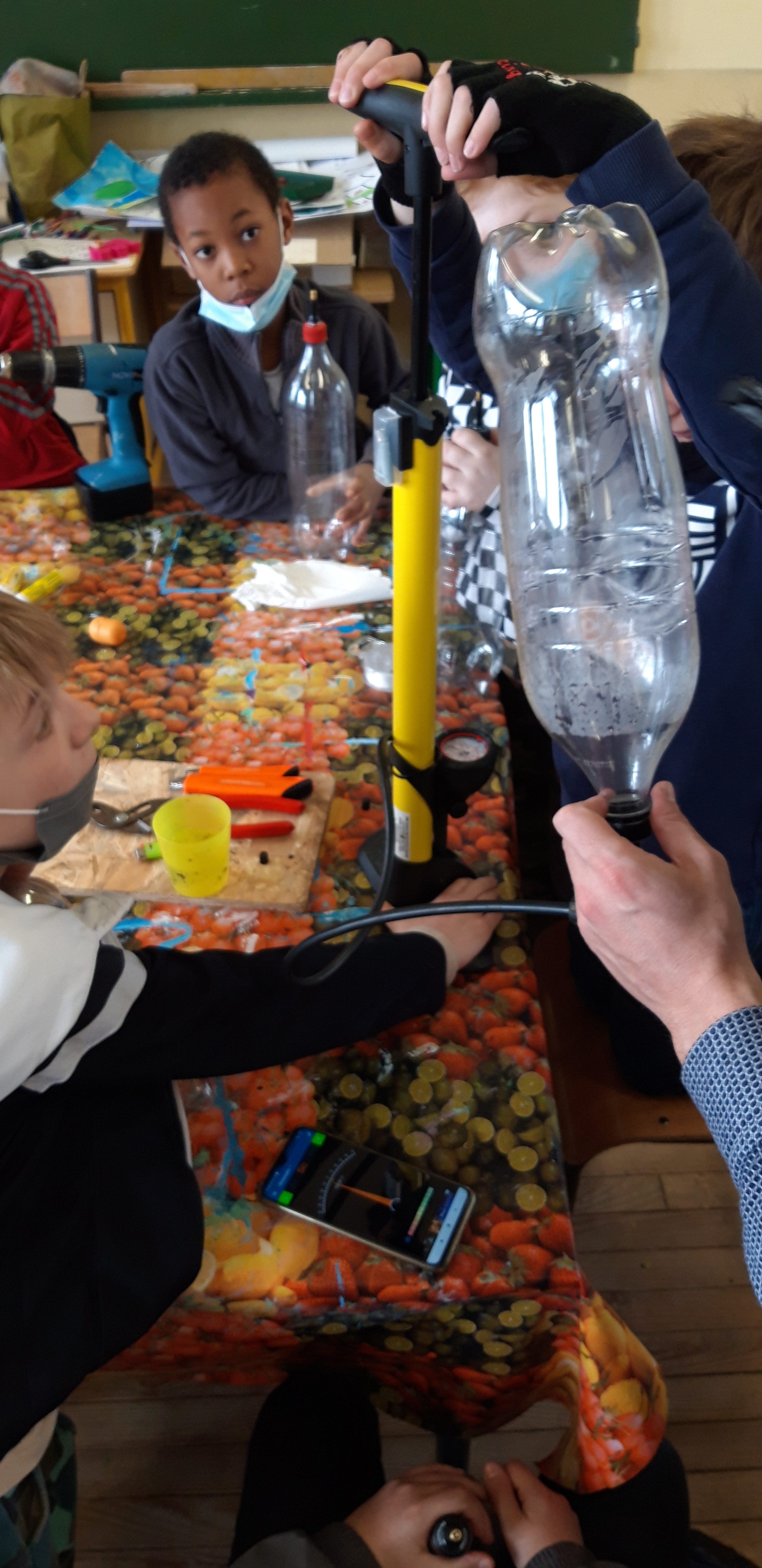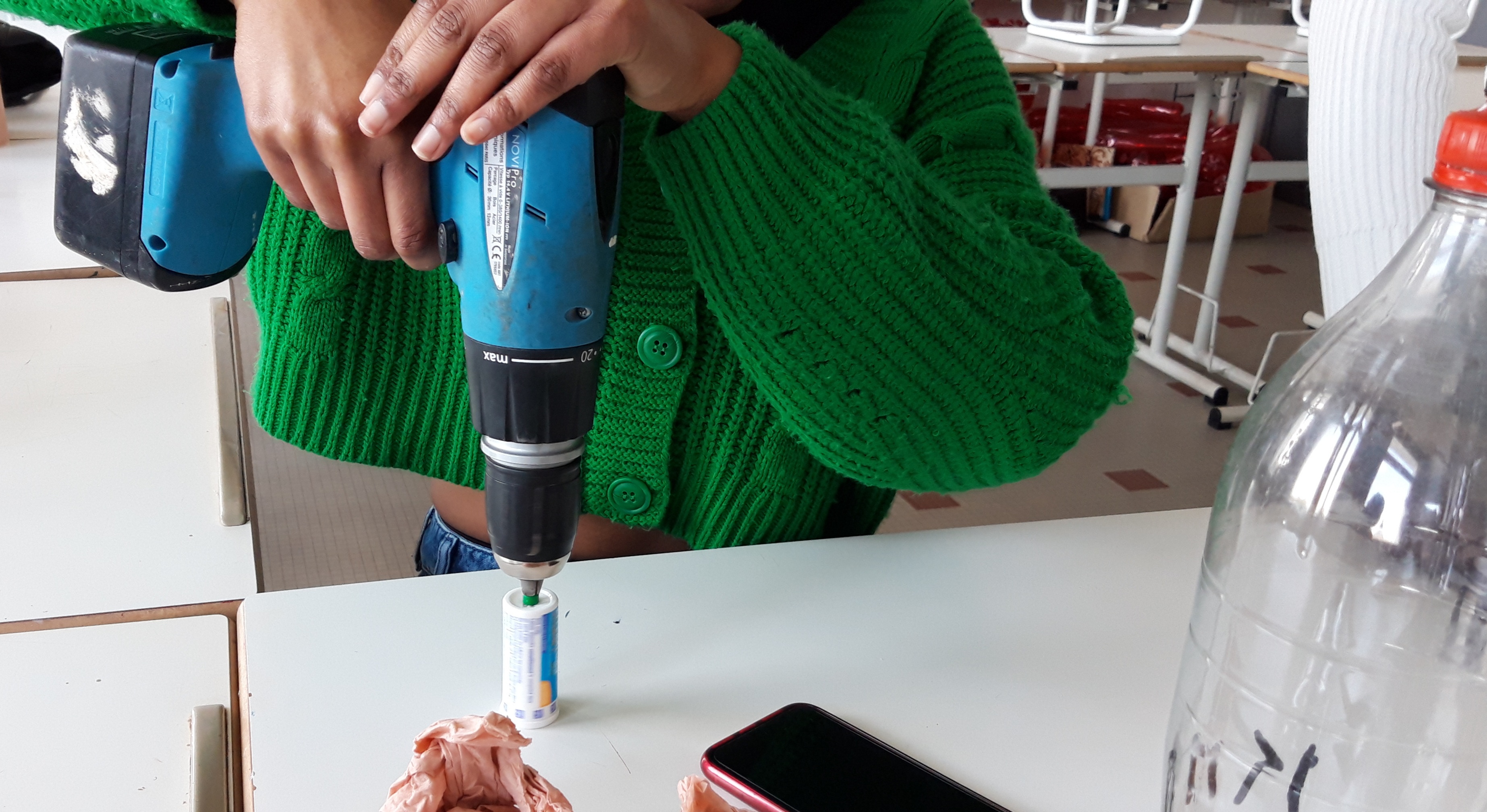 Durant les venues ( 4 séances, 12h) de Ben à l’école, chaque élève de la classe ULIS a construit un cocaphone et une rhombe. Puis à partir d’une composition musicale de Ben, la classe a écrit, collectivement, un morceau en lien avec le plastique. Après plusieurs répétitions et un travail d’interprétation, est venu le temps d’enregistrer le morceau.