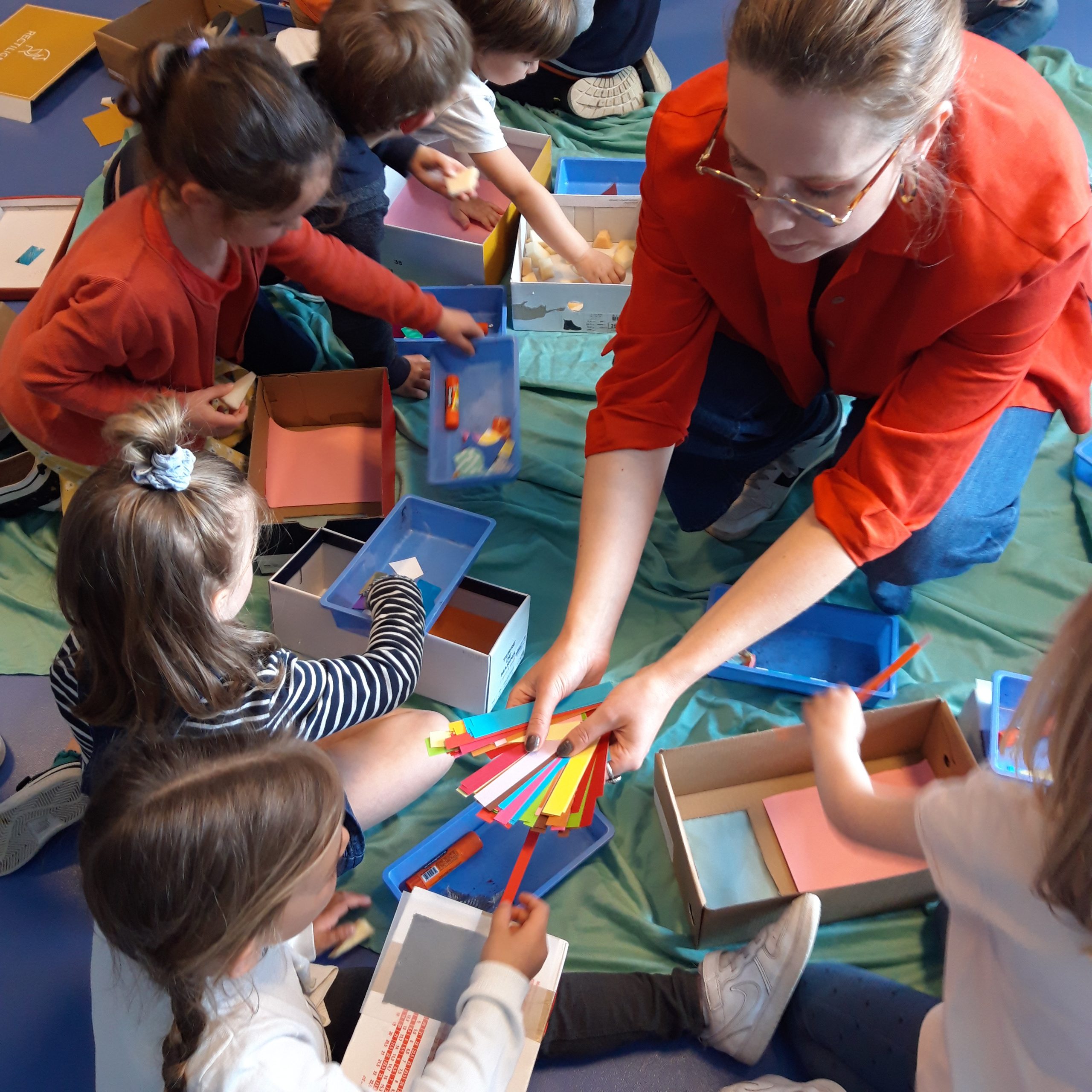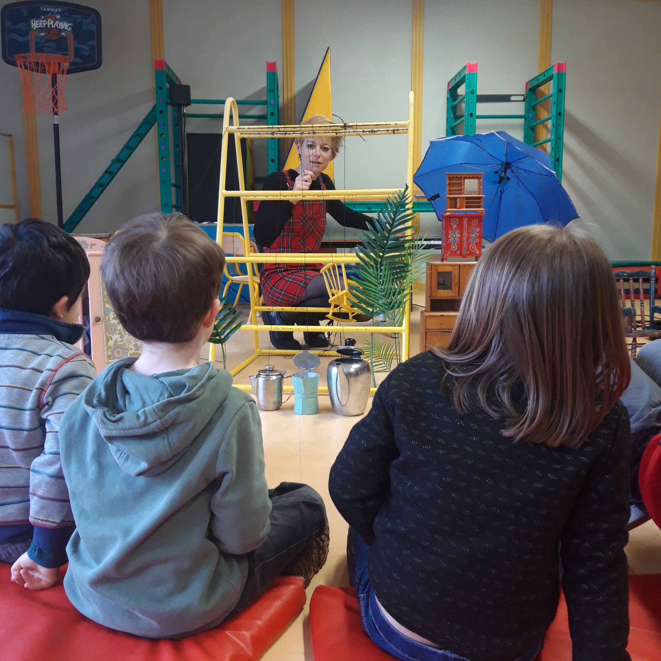Les 2, 3 et 4 avril, nous avons accueilli le premier spectacle JP (Hablame cosita) de Alice Dourlen pour plusieurs séances scolaires (et familiales). A la suite, Alice, est venue en classe le 14 avril dernier. Installés sur des tapis rouges en salle de motricité, les enfants ont découvert l’envers du spectacle.