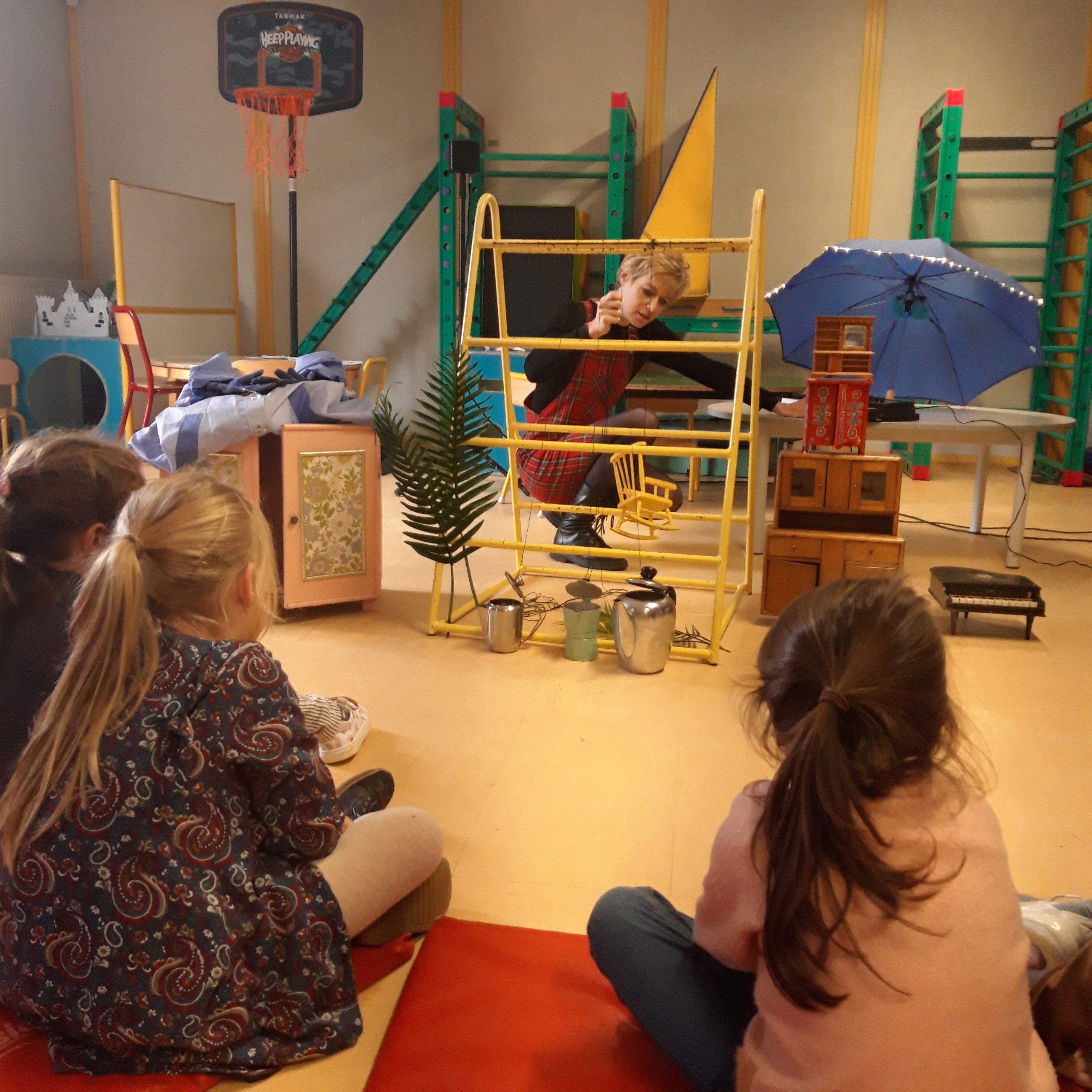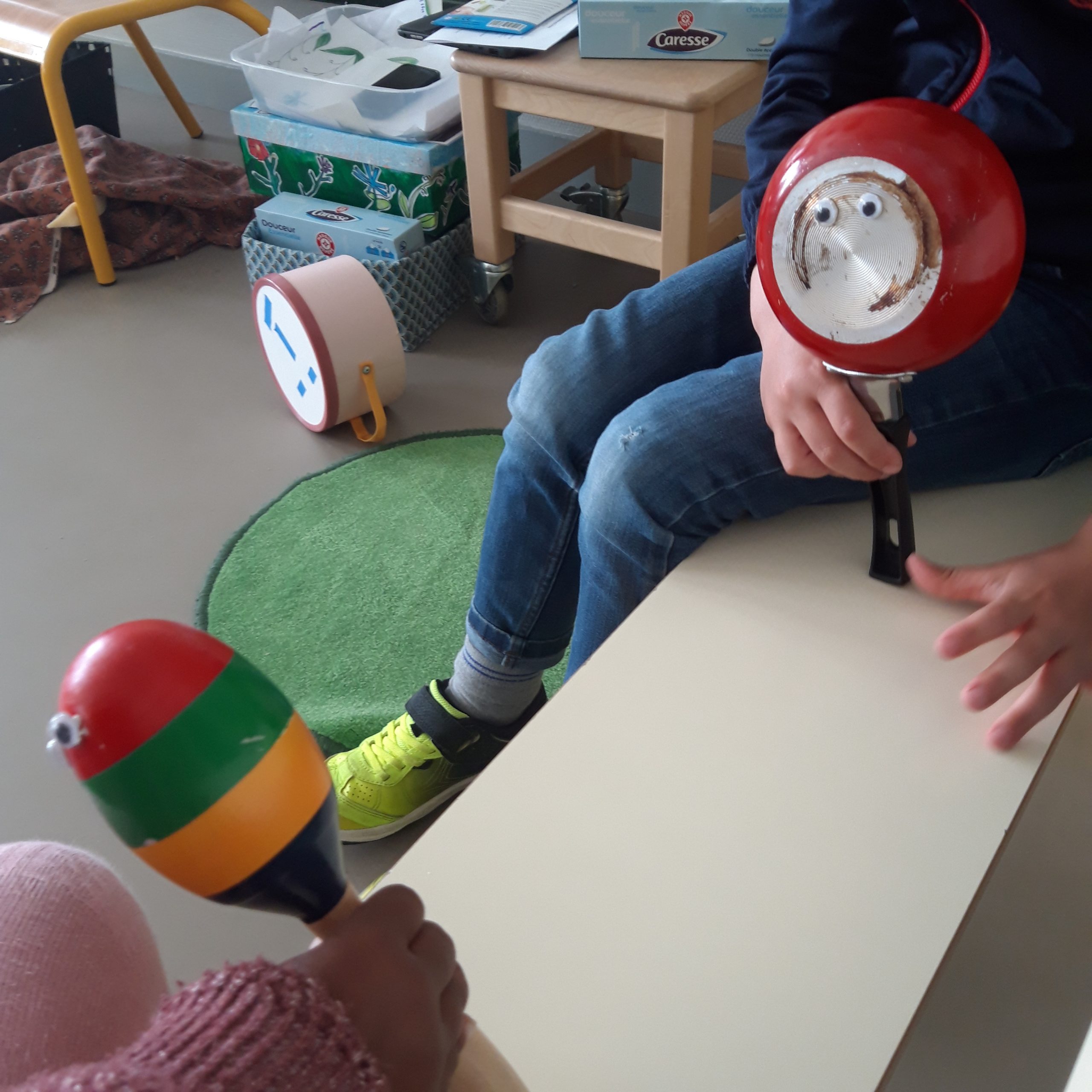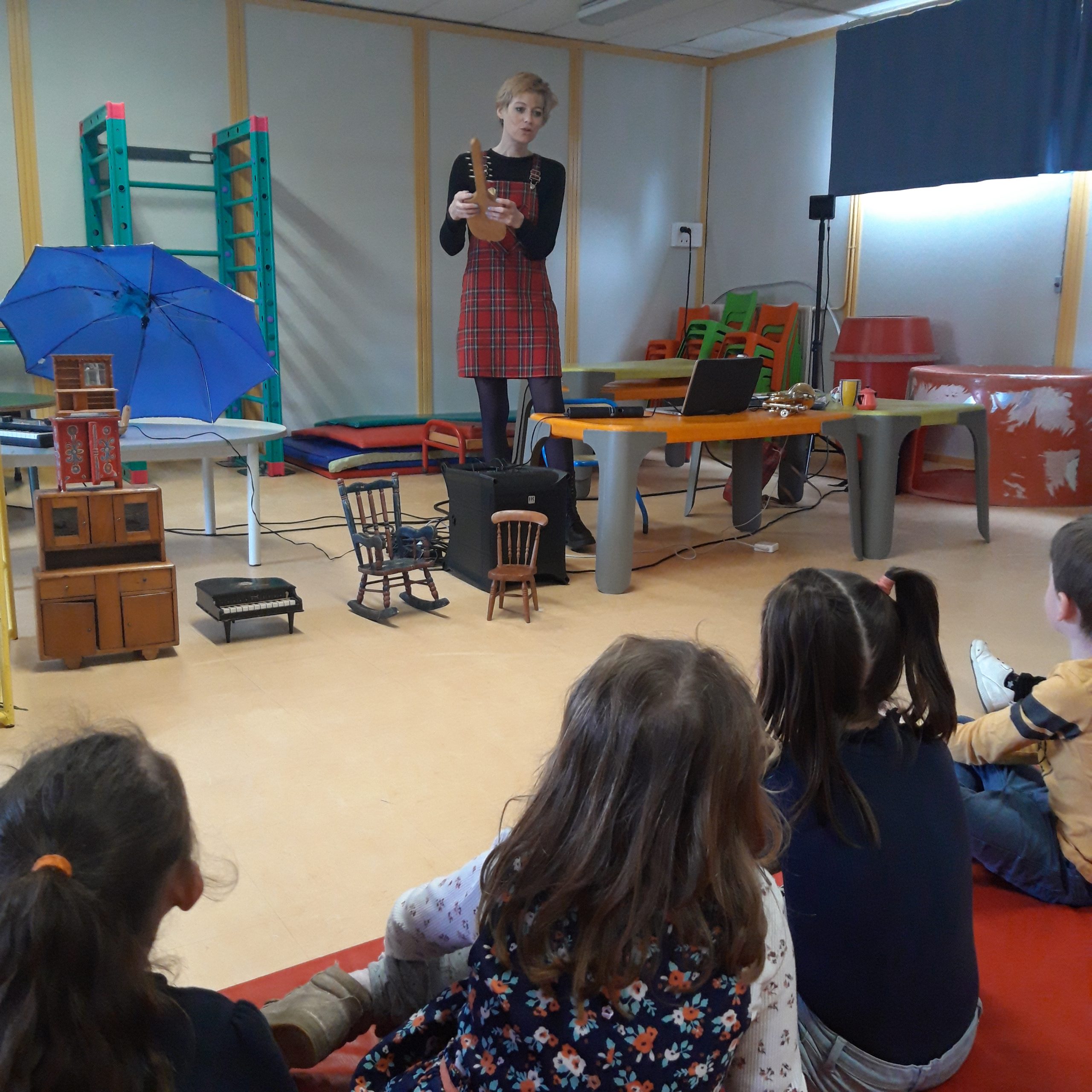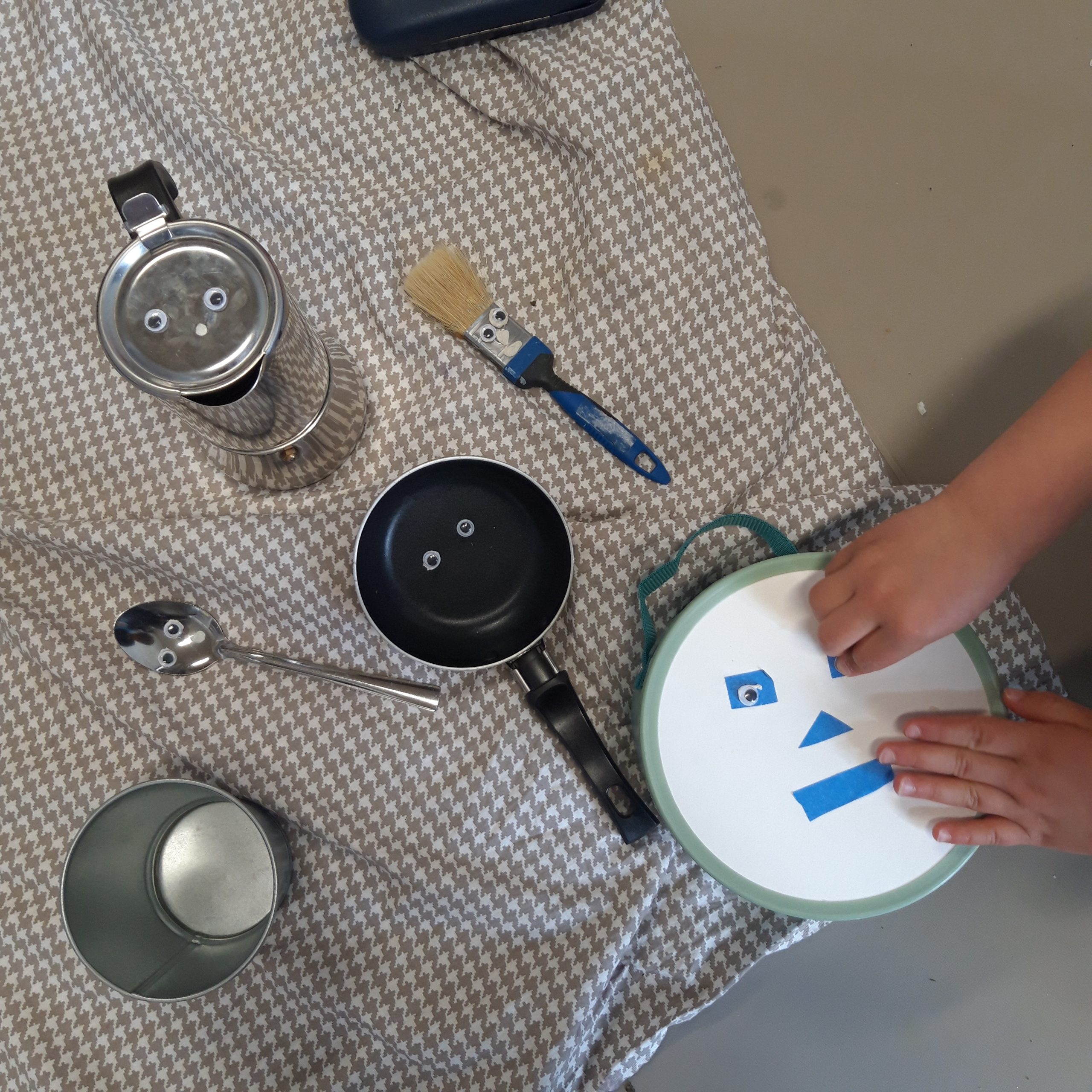 Pour commencer, petit retour sur leurs souvenirs en écoutant des extraits musicaux du spectacle et en évoquant, par exemple, la taille des objets (réelle, miniature, géante) un peu « comme dans un rêve ». Alice a aussi expliquer comment elle détournait des objets pour les transformer en instruments de musique (casseroles, couverts à salade pour baguettes de batterie, maracasse à partir d’une cafetière de dinette…). Les enfants ont pu (re)écouvrir des instruments joués pendant le spectacle (trompinette, harpette (instruments inventé)). Puis place à la manipulation! En binôme, un.e musicien.ne de cafetières et un.e marionnettiste jouent de cette surprenante chorale.