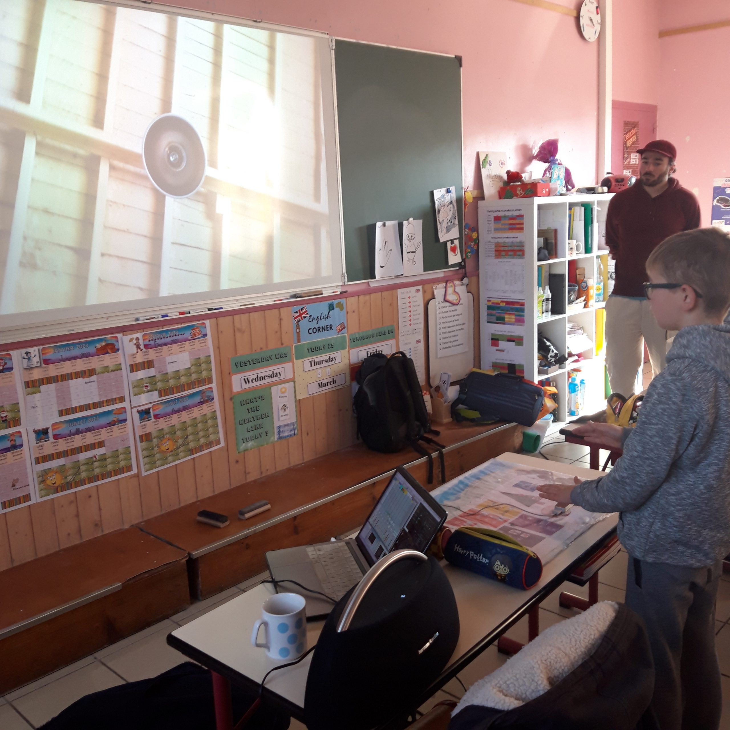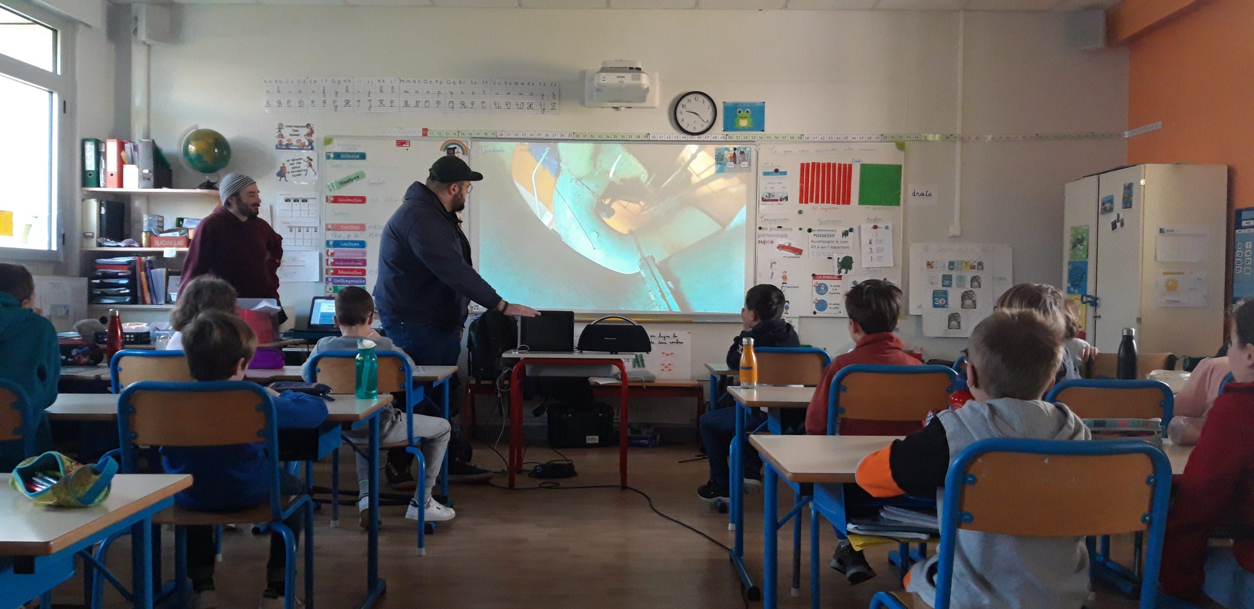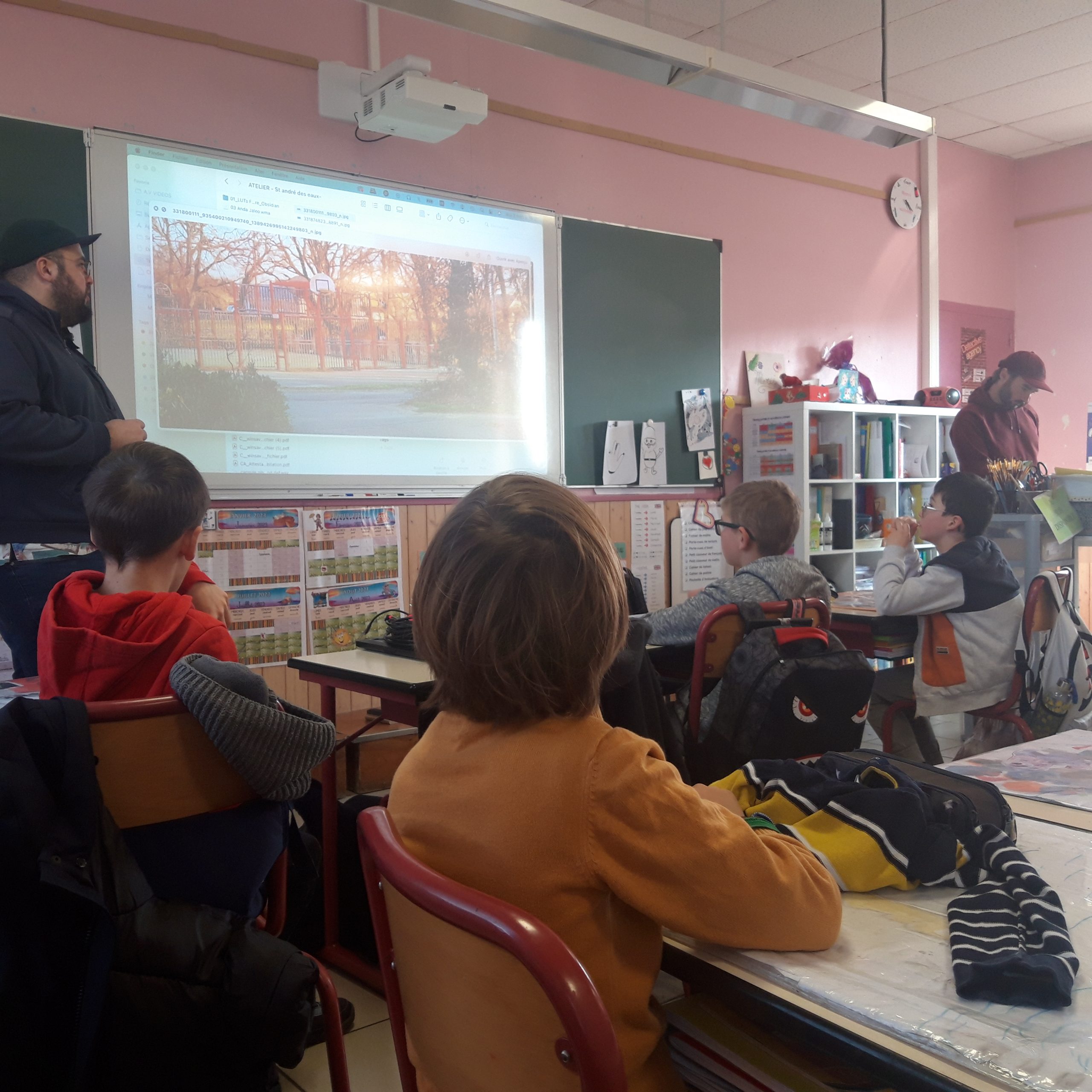 Lors de la première séance, les élèves ont fait connaissance avec Axel, Sami et l’univers artistique du duo. A partir de vidéos réalisées lors de précédents ateliers, les enfants ont testé l’installation interactive Evasion. C’est sur cette dernière que les classes restitueront collectivement le 12 mai prochain au VIP.
