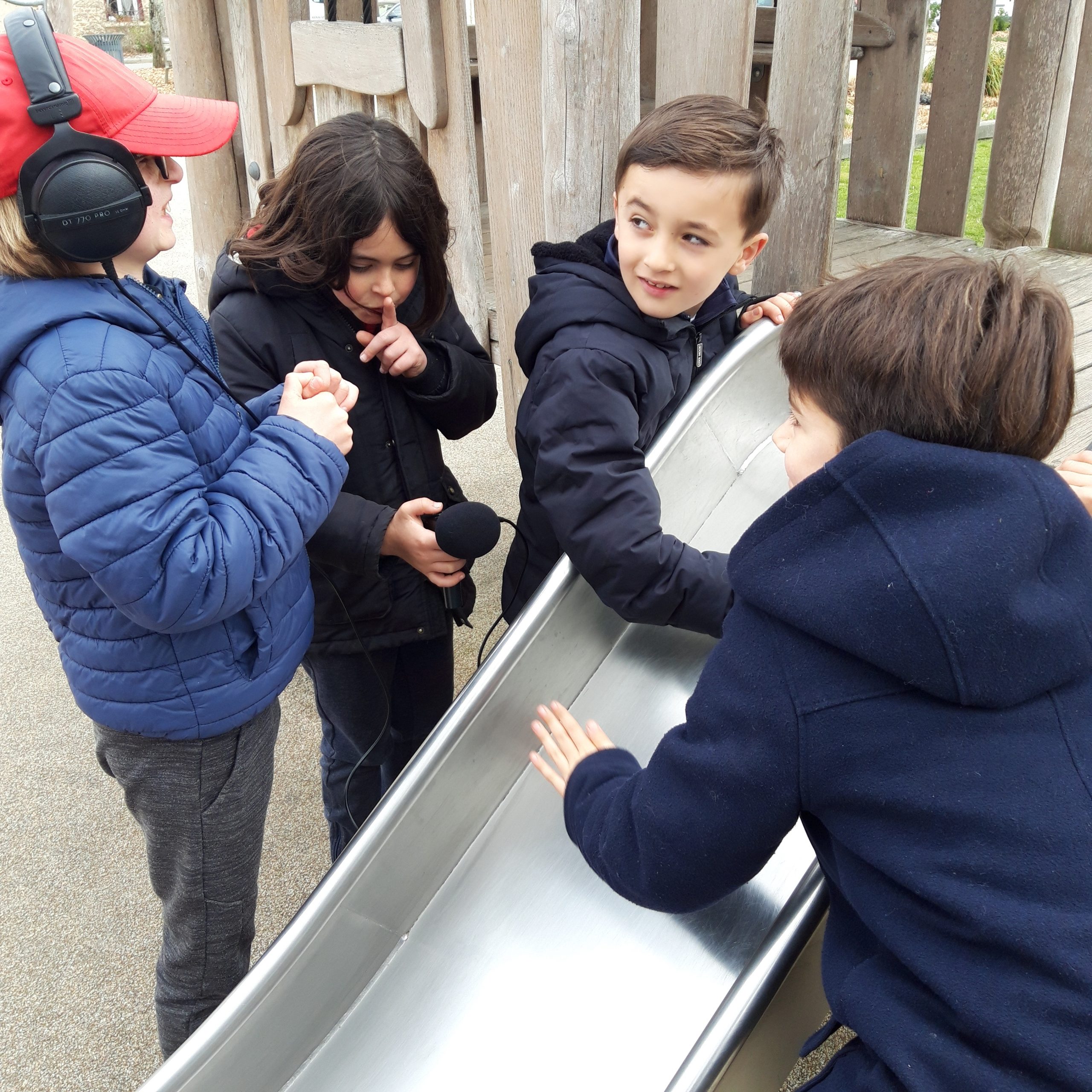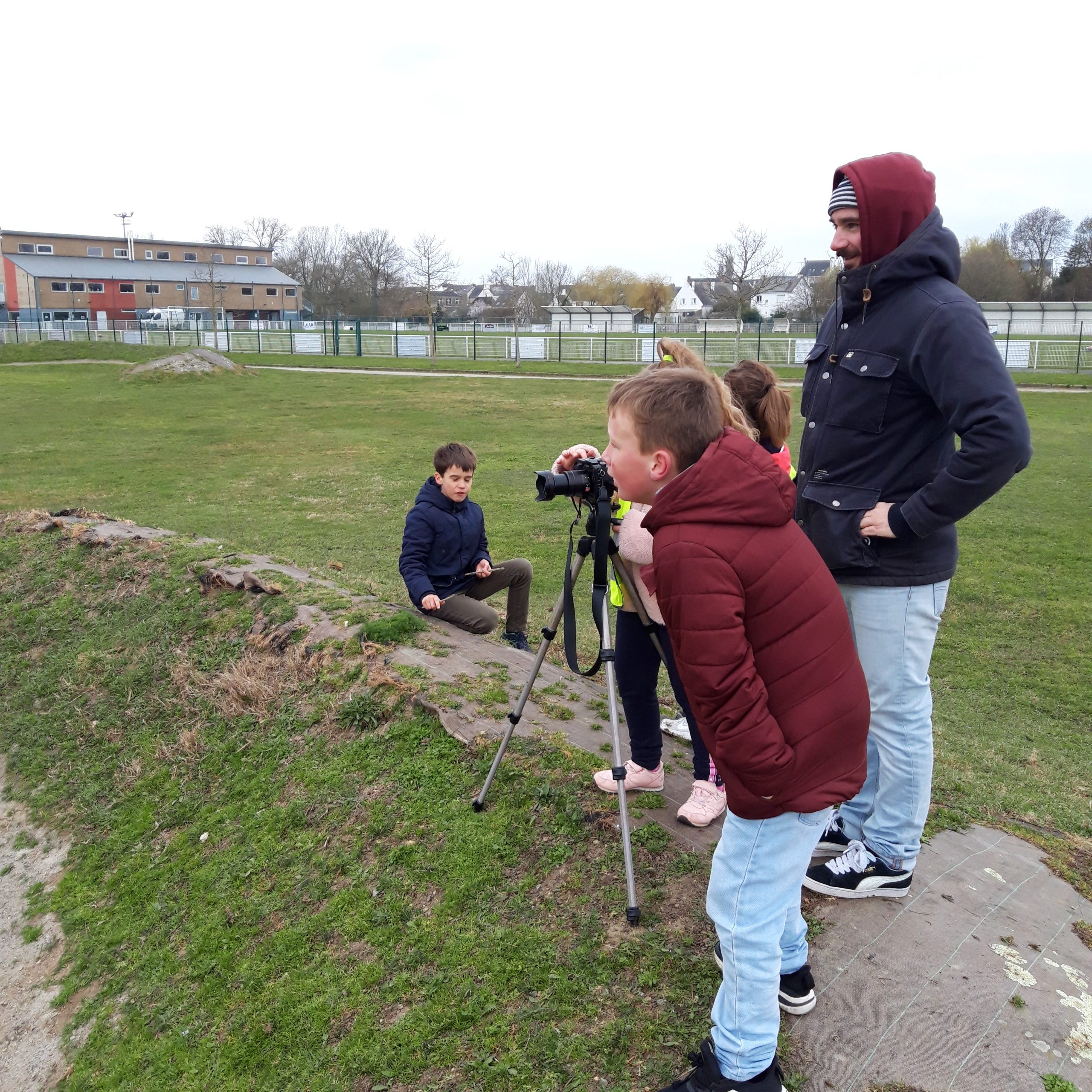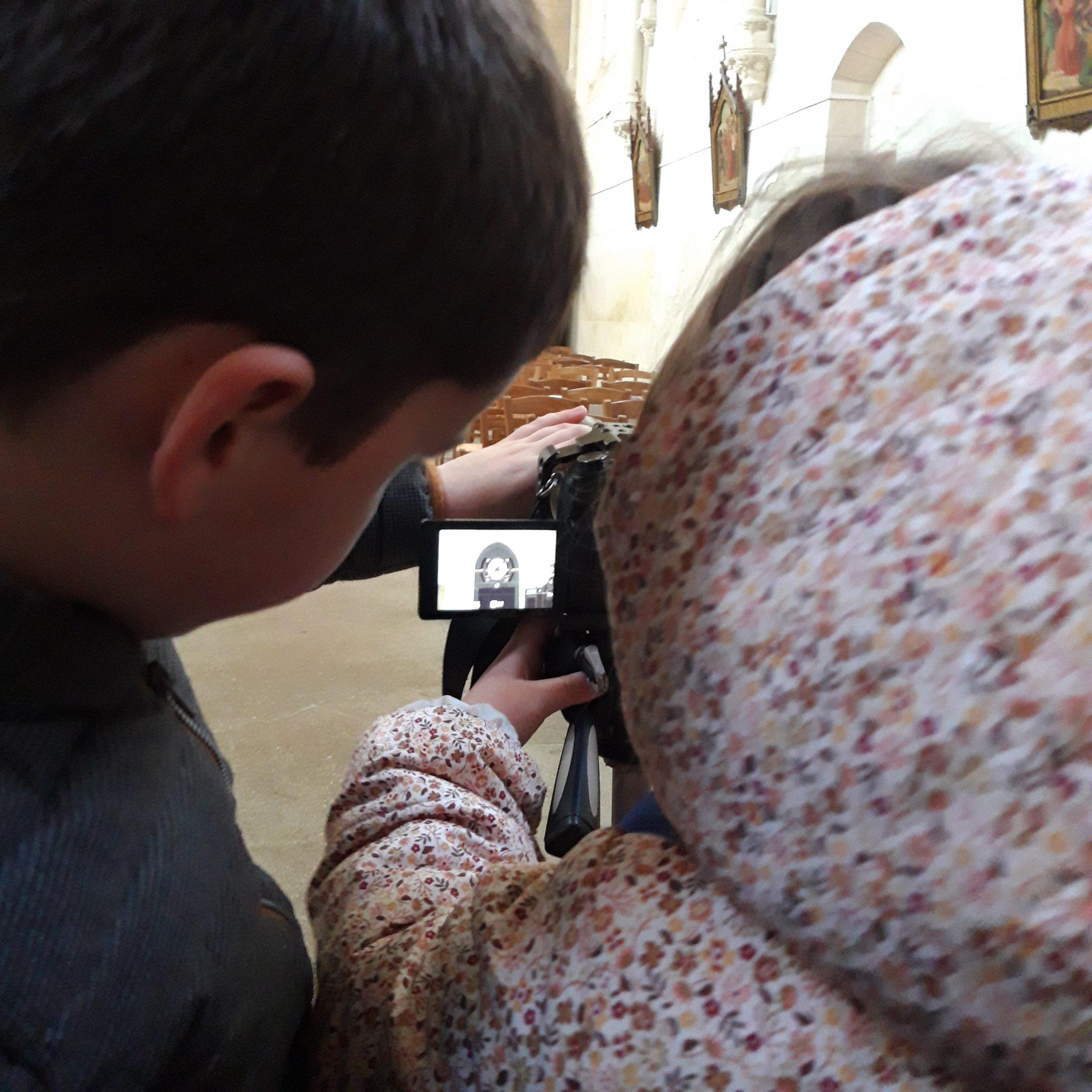 La seconde séance débute par un voyage en car, direction l’école d’une autre commune ou les enfants sont attendus pour un temps collectif. Puis à pied, les enfants des rendent sur les lieux choisis par les copain.ines de l’autre école! Une demie journée par lieux, la classe en demi groupe (afin que les enfants découvrent les 2 processus de création) passe de la vidéo au son (entrecoupé d’un moment très attendu… le pique nique!)