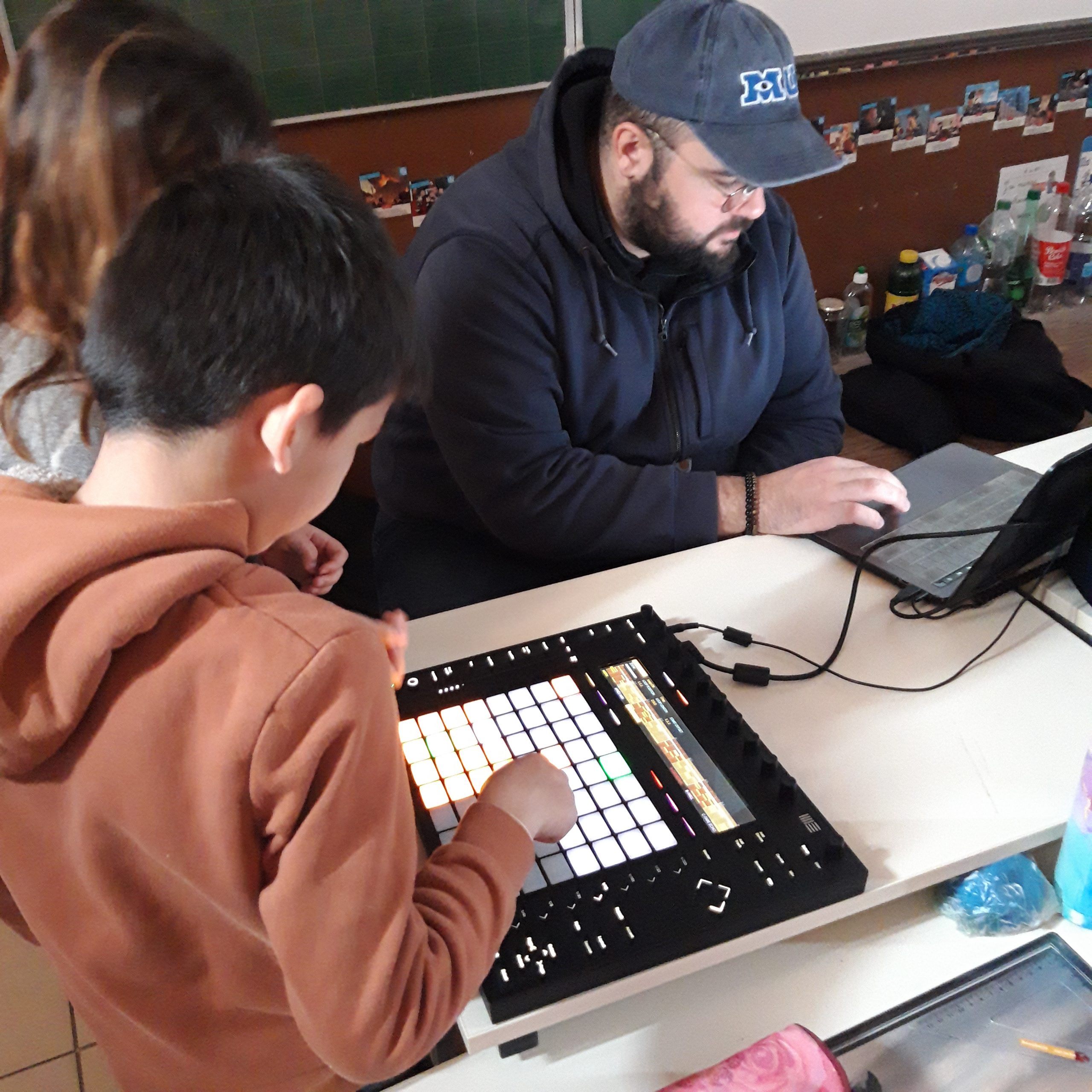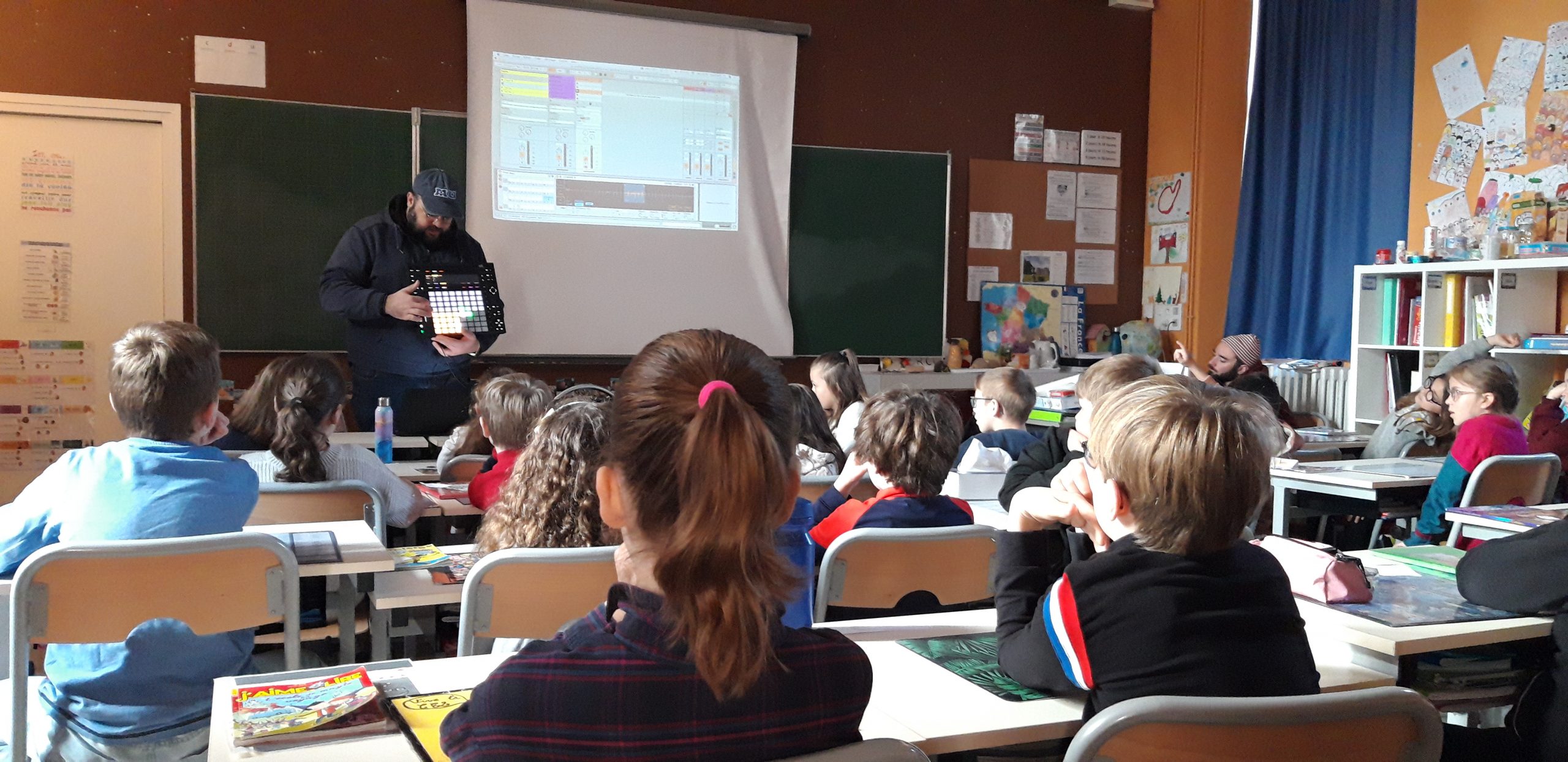 Durant la 3ème séance, pour la partie sonore, présentation du logiciel et de son fonctionnement. Écoute de tous les sons enregistrés, triés et retravaillés puis découverte des effets possibles sur un son (rythme, son, effets…). Sami a expliqué le fonctionnement du pad, que chaque son est enregistré et correspond à un bouton. Par groupe de 2, les élèves ont créé la base rythmique.