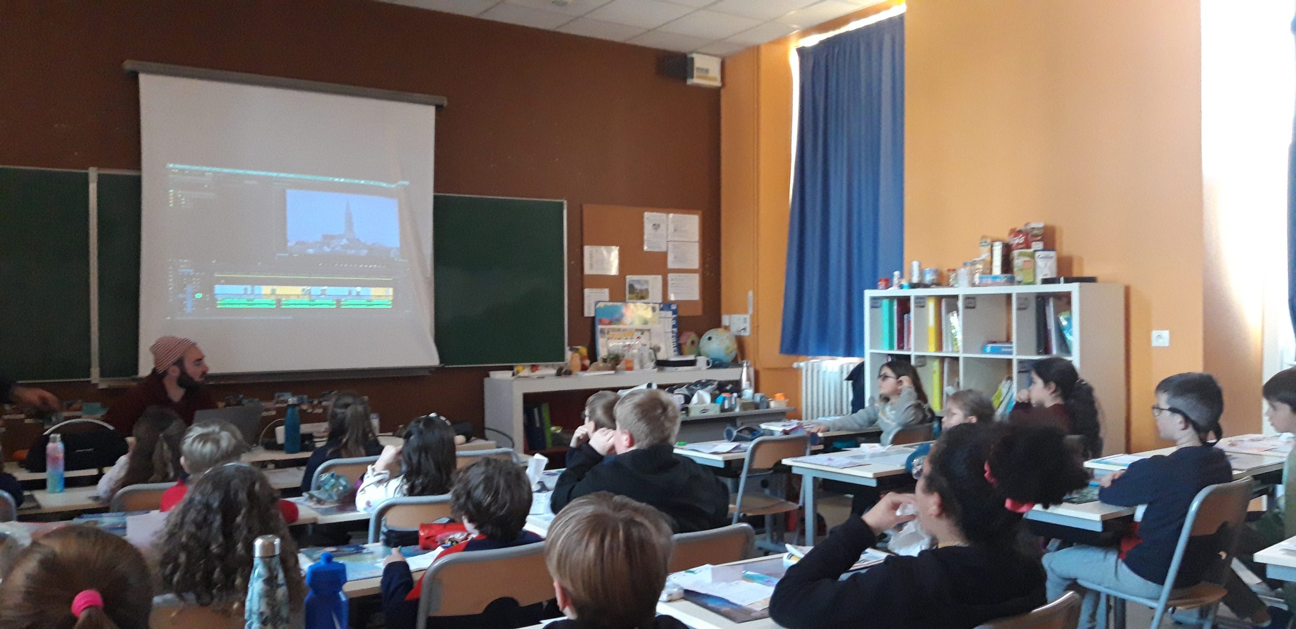 Puis au tour d’Axel d’intervenir. Les élèves ont visionné des vidéos dérushées (triées) en amont puis montage des images sur la musique avec un traitement à l’aide de calque d’effets pour saturer les couleurs et donner du volume et du caractère à la vidéo.