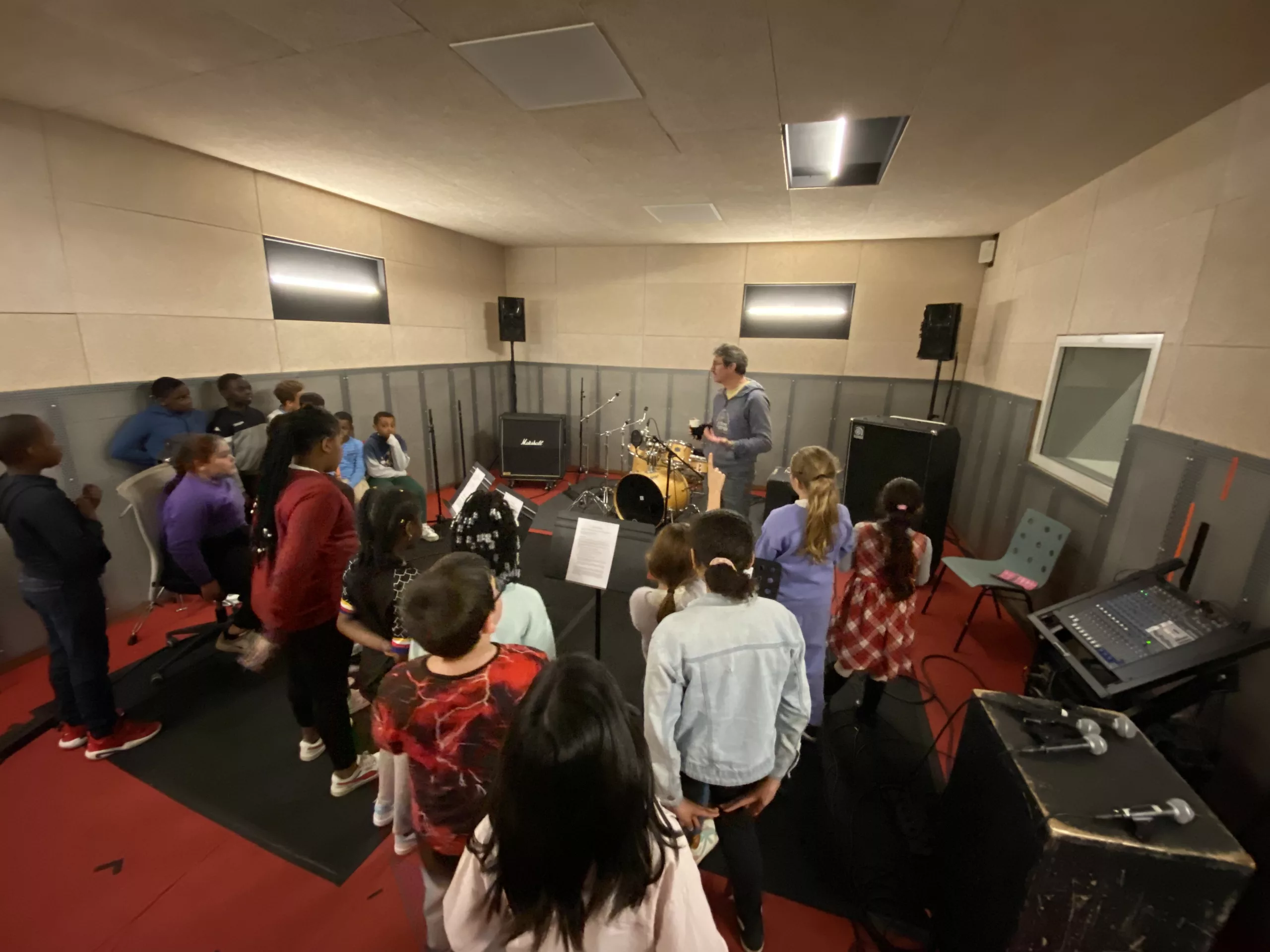 Ça y est c’est le grand jour, direction les studios du VIP pour l’enregistrements des dialogues et de la narration du conte! Les élèves ont aussi découvert la rigueur et l’attente lors de sessions d’enregistrement (3h). Répartis en petits groupes, quand les élèves n’enregistraient pas leur partie, ils ont découvert les dessous de l’enregistrement en cabine avec Joris, visité la salle et les coulisses, profité d’un temps calme autour d’ illustrations tirées du livre de coloriages du label (The Third Man Record) de Jack White;)