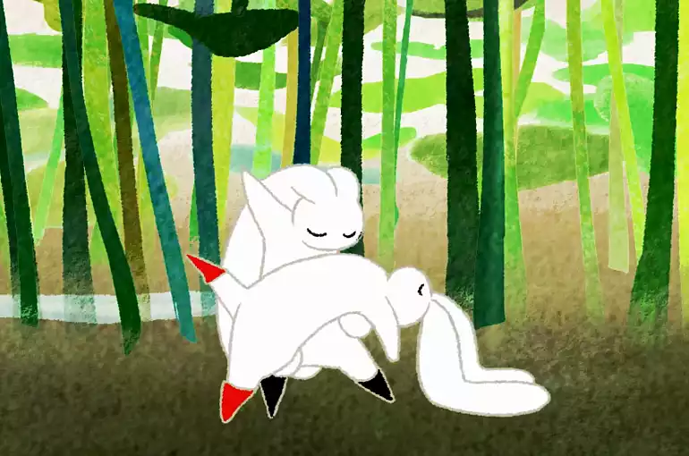 Dancing in the Rain de Baek Miyoung • 2016 – 2 min : Deux lapins dansent sous la pluie.