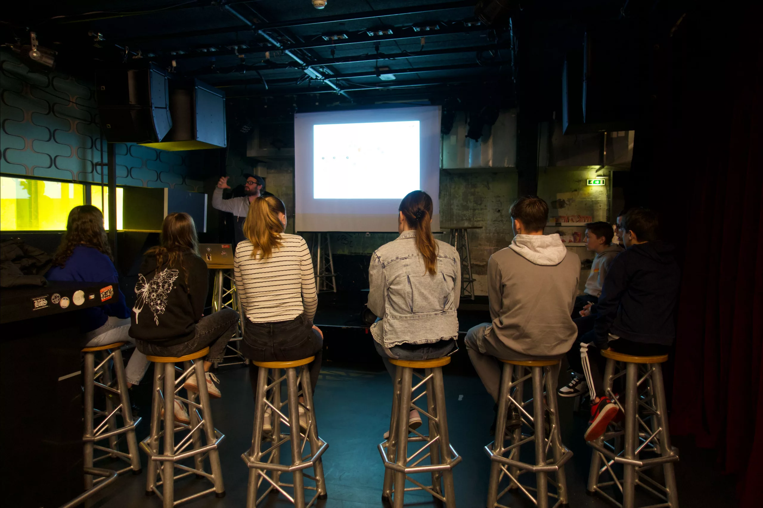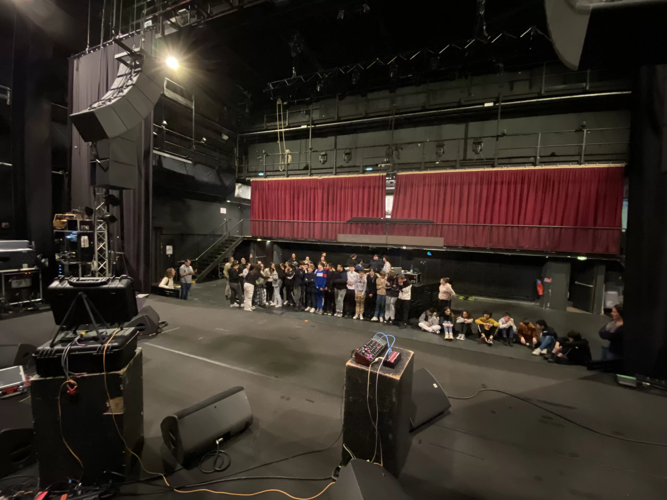 Avec Erwan (régisseur son) ils ont découvert les bases de la sonorisation façade (destinée au public) à partir de ce qui se passait sur scène. L’atelier abordait également le fonctionnement du son, de l’oreille, ainsi que les risques auditifs.